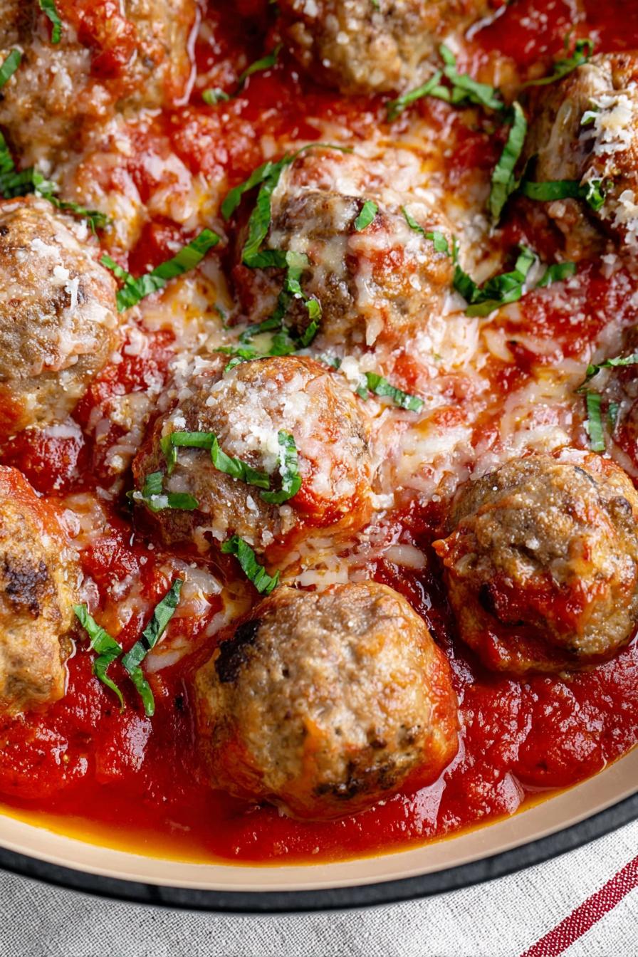 Carne moída combinada com pão branco embebido em leite evaporado para textura macia. Cebola e alho ralados trazem aroma, salsa fresca e ovos ligam tudo. Carne bovina, suína e frango moído em porções, misturados delicadamente para textura boa. Bolinhas grandes de 5 cm, assadas até dourar, depois cozidas lentamente em molho de tomate aromático com manjericão, açúcar e folha de louro. Molho feito refogando cebola e alho no azeite, cozinhando até o sabor casar. Resulta almôndegas suculentas, saborosas, com textura que surpreende. Serve fácil e rende bastante.