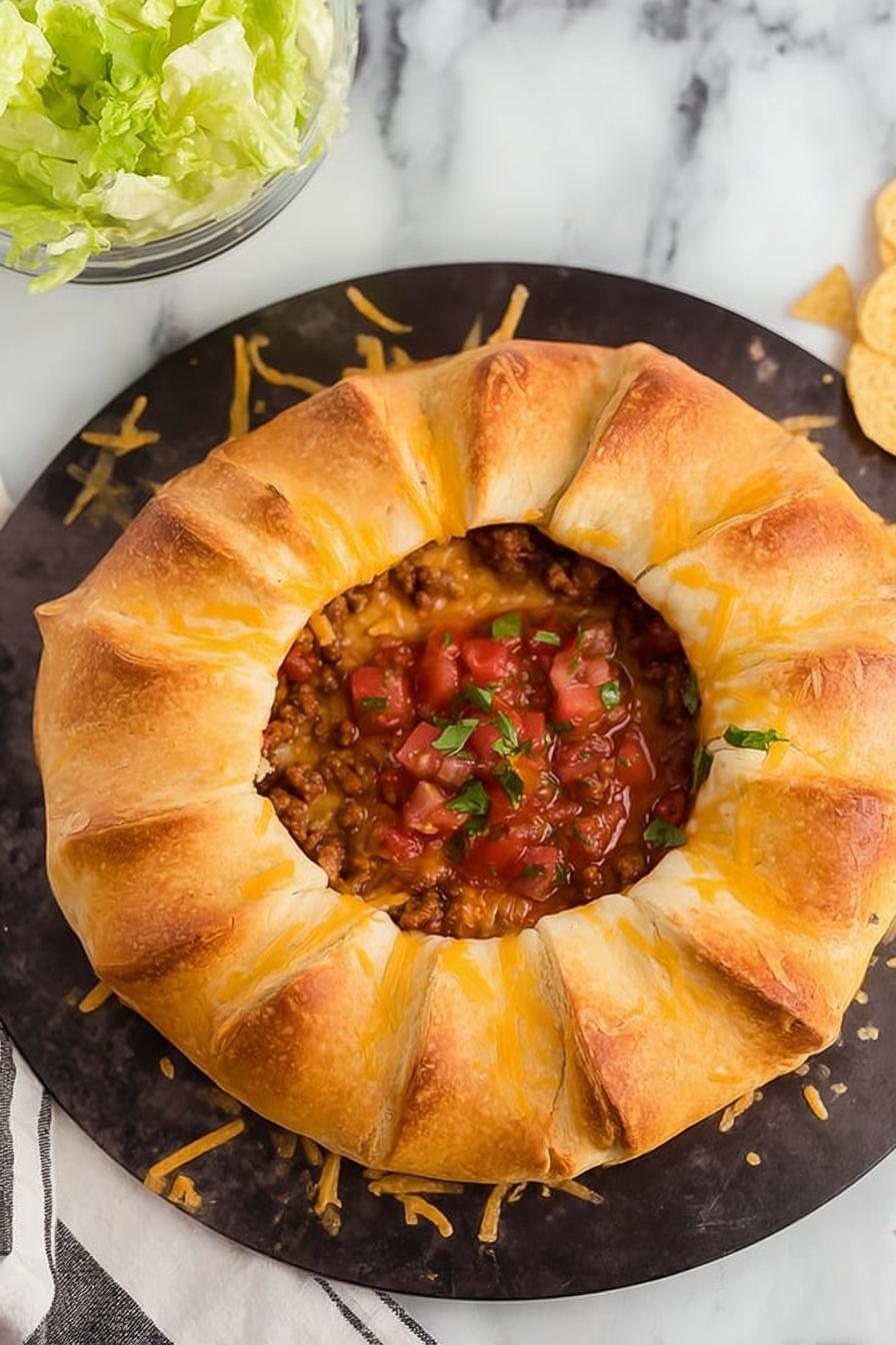 Antes de montar o anel, garanta que o recheio esteja só levemente úmido, sem excesso de líquido. Isso evita molho escorrendo e massa empapada. O truque do bowl no meio para organizar a massa facilita muito, não tente fazer o círculo só no olhômetro, uma errada ou outra e já quebra a simetria do prato. Dobre as pontas da massa apertando bem para que o fechamento fique firme — massa aberta escapa recheio no forno. Na hora do forno, controle pelo cheiro e pela cor da massa; o tempo indicado é só referência, o ponto ideal varia de fogão para fogão. Retire só quando a massa estiver crocante e bem dourada. A pausa após sair do forno é indispensável para o recheio firmar; ele não deve escorrer quando cortar senão perde a graça toda. Acompanhe com salsa gelada, que equilibra a sensação geral no paladar e ajuda a balancear o prato pesado.