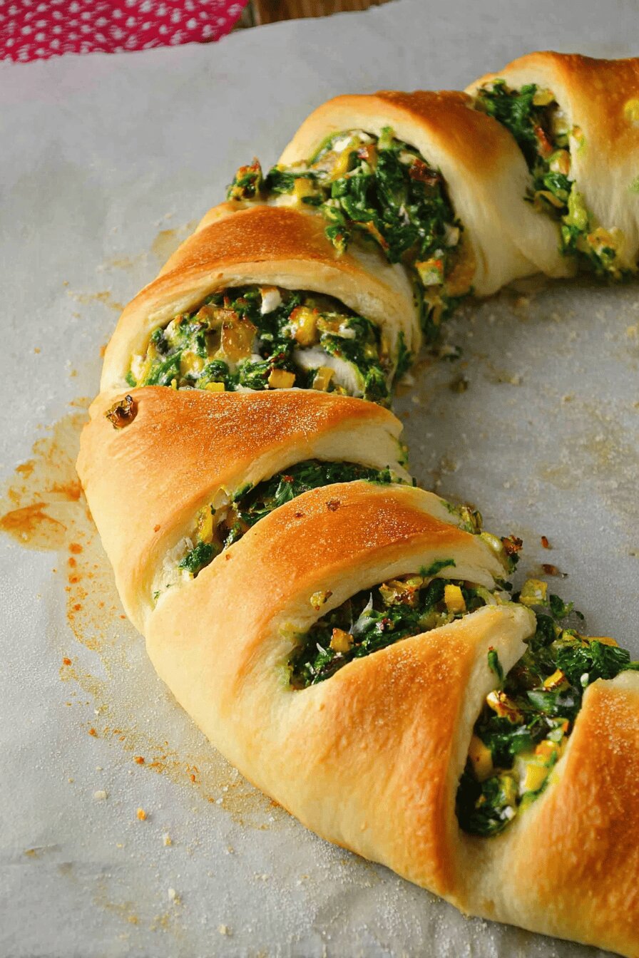 Esse anel folhado de espinafre é daqueles preparos que se aprende na raça, testando proporções e substituindo ingredientes conforme o que tem na geladeira. Aprendi a importância do espinafre bem seco após várias tentativas onde a massa ficou encharcada e pesada. A troca do pimentão vermelho pelo tomate seco traz um sabor mais concentrado, quase adocicado, e a ricota fresquinha suaviza o recheio sem tirar o frescor e leveza. A massa folhada, sem pressa, ganha cor dourada e crocância que fazem o prato brilhar na mesa. Um prato que entrega textura, aroma e sabor com simplicidade e personalidade.