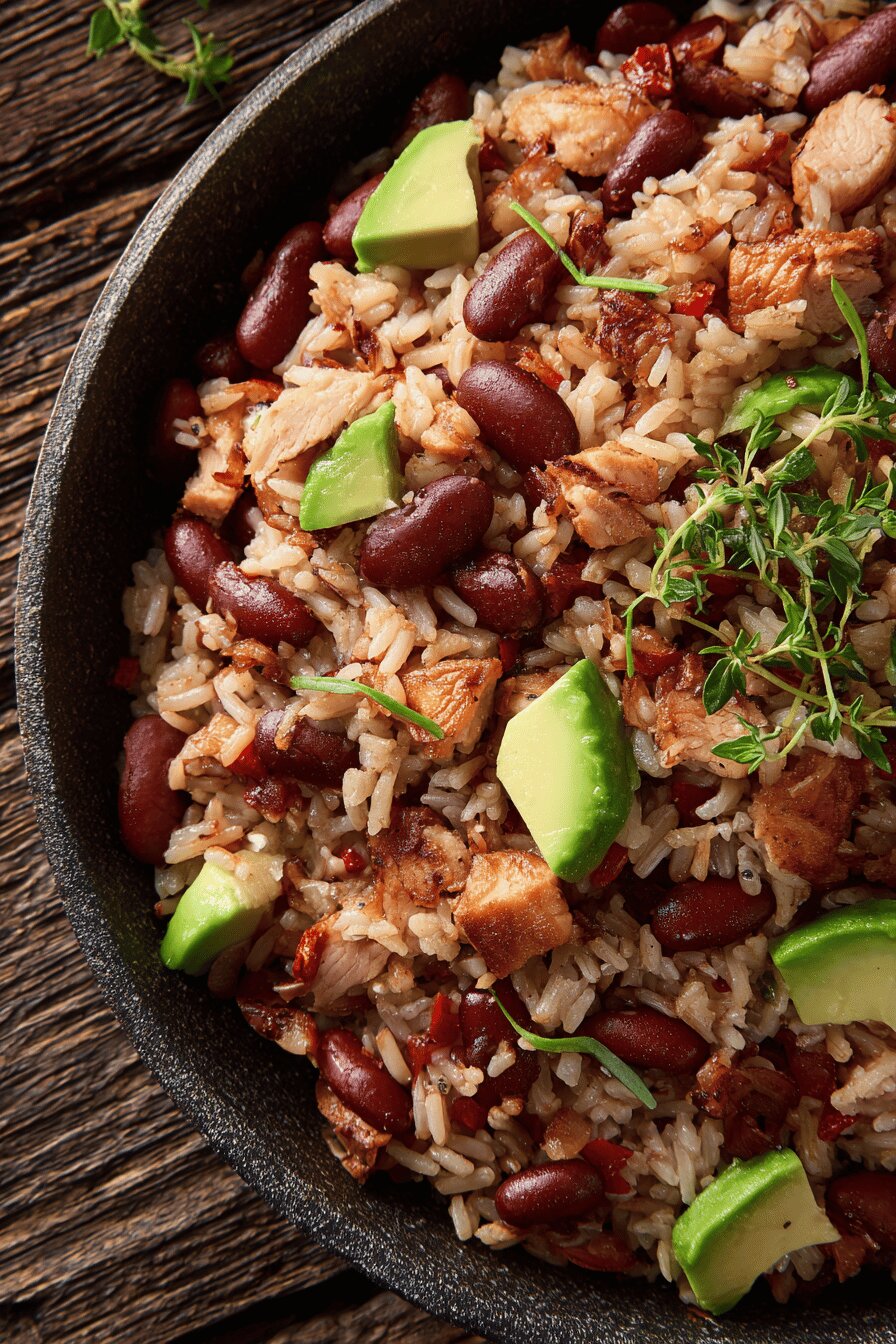 Arroz basmati com feijão vermelho usado em conserva, cozinhar no caldo deles que foi separado. Bacon picado ou óleo vegetal para refogar cebola, junto com uma mistura de tempero haitiano que inclui sucos e especiarias. Pimenta scotch bonnet inteira para aroma sem muito ardor direto. Tomilho integra primeira fase do cozimento. Temperar com sal e pimenta do reino a gosto. Cozinhar com tampa e fogo baixo, deixar descansar antes de servir para textura solta, porém úmida.
