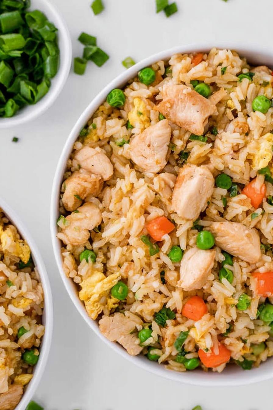 Arroz frito estilo asiático usando arroz jasmim, frango cozido, ovos mexidos, ervilhas congeladas e cenoura. Refogado com óleo vegetal, cebola, alho, óleo de gergelim e shoyu. Receita prática, com técnica para manter os ingredientes soltos e texturas equilibradas.