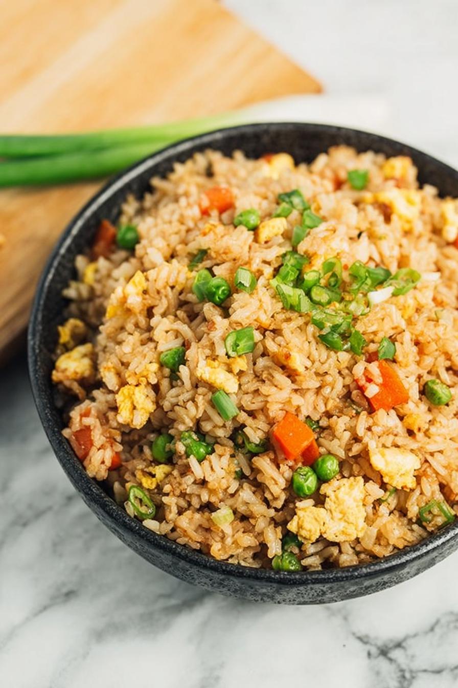 Arroz cozido refogado num óleo vegetal até esquentar e dourar levemente. Cebola e alho soltando aroma forte e caramelizando de leve. Ervilha e cenoura congeladas na medida, só até amolecerem, não murcharem. Ovos caem no centro da frigideira quente, rápido mexidos. Molho de soja com óleo de gergelim dá sabor e brilho. Cebolinha verde picada no topo. Fácil de ajustar, troca ervilha e cenoura por brotos de feijão ou milho, troca óleo por manteiga para toque diferente. Receita rende 4 porções e roda rápido, com calorias controladas, alimentar e saboroso que é luz na cozinha na pressa.