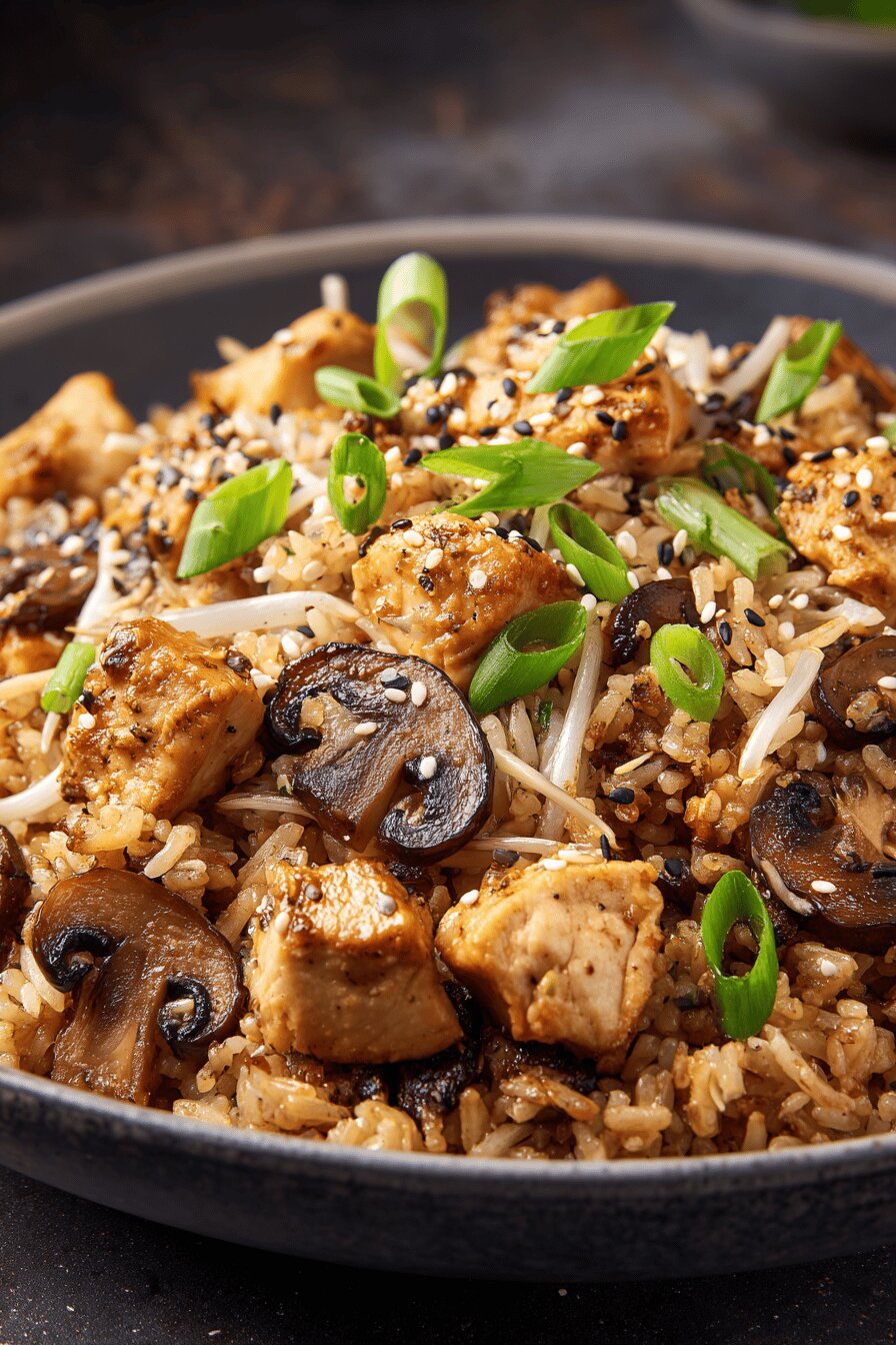 Frango em cubos marinado com uma mistura de shoyu, mel e óleo de gergelim, refogado com cogumelos frescos e gengibre, misturado a arroz integral cozido e brotos de feijão crocantes. Finalizado com cebolinha e sementes de gergelim torradas, essa variação troca cogumelos brancos por shiitake e substitui o mel por melaço de cana, trazendo um toque mais profundo e levemente amargo. Técnicas simples de refogar e acertar o ponto do arroz, além de truques para conservar a umidade do frango mesmo sem pele, fazem desse prato um verdadeiro coringa para uma refeição rápida e nutritiva.