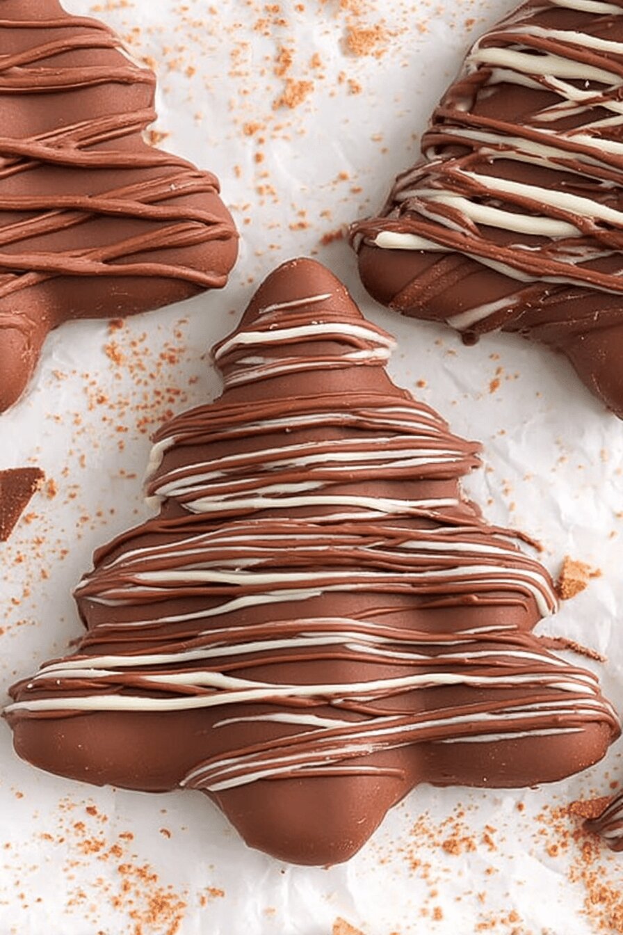 Alisar a mistura na assadeira com papel manteiga ajuda a não grudar e deixa com altura uniforme, essencial pra cortar árvores lisinhas. Na hora de colocar no freezer, observo que 20 minutos mais 5 de descanso fazem toda a diferença pra massa firmar sem endurecer demais, prevenindo rachaduras. O passo de levantar a primeira folha com cuidado evita esfarelamento; papel seco ajuda nesse manuseio. Cortar em formato de árvore não é só charme, é questão de firmeza na peça — formato maior costuma segurar melhor no chocolate. Ao mergulhar no chocolate, faço devagar e uso garfo para evitar excesso, senão escorre e bagunça tudo. Se a pasta amolecer, volta pro freezer mesmo antes de terminar tudo, não tem mistério. Secar devagar fora da geladeira evita condensação, mas se tiver pressa, geladeira ajuda. O toque final da calda em zigzag é mais que estética, reforça textura, então não tenha pressa nem medo de exagerar um pouco.
