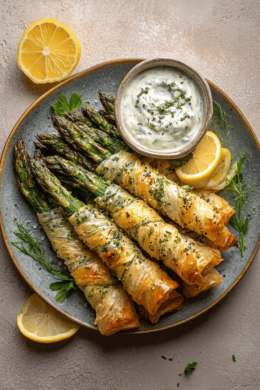 Aspargos enrolados em massa crocante, banhados em manteiga com coentro e pimenta, acompanhados por um molho cremoso que mistura iogurte e maionese com ervas frescas. É uma entrada que junta textura e frescor de modo simples e impecável. A principal pegada aqui é controlar cada etapa para o aspargo ficar firme e a massa, crocante, sem cair na armadilha do ressecado. Já testei com ervas diferentes e a mistura com coentro fez toda a diferença, o frescor do molho eleva o prato. Perfeito para impressionar sem esforço e deixar um gostinho de quero mais. A mistura cítrica do limão na manteiga e no molho traz elegância natural. Nunca deixo de lembrar que massa fina não tolera pressa nem erro na temperatura.