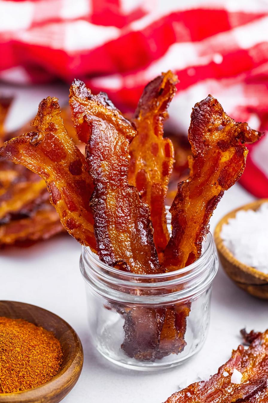 Tiras de bacon assadas até quase crocantes, mas com um toque mastigável, cobertas por uma mistura de açúcar mascavo escuro, sal, páprica defumada e pimenta caiena para um sabor com personalidade. O açúcar cria uma crosta doce que contrasta com a gordura do bacon e o leve toque picante. Recebendo atenção constante durante o forno para evitar queimar, o bacon fica com textura balanceada e aparência brilhante. Pode ser servido quente ou depois de esfriar por completo, ideal para petiscos, saladas ou para incrementar sanduíches. Uma variação prática e saborosa do bacon caramelizado tradicional com um toque brasileiro na pimenta.