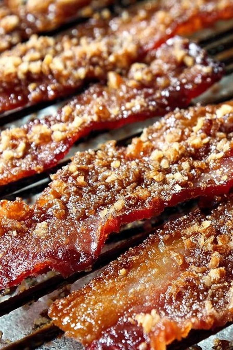 Combinação intensa de bacon crocante com cobertura açucarada e nozes picadas, assado para textura perfeita. Substituições indicadas para açúcar e nozes, com dicas de textura e aroma pra resultado top. O toque final é aquela sensação caramelizada que só o praliné entrega, além do bacon suculento com crosta quase estalando ao toque.