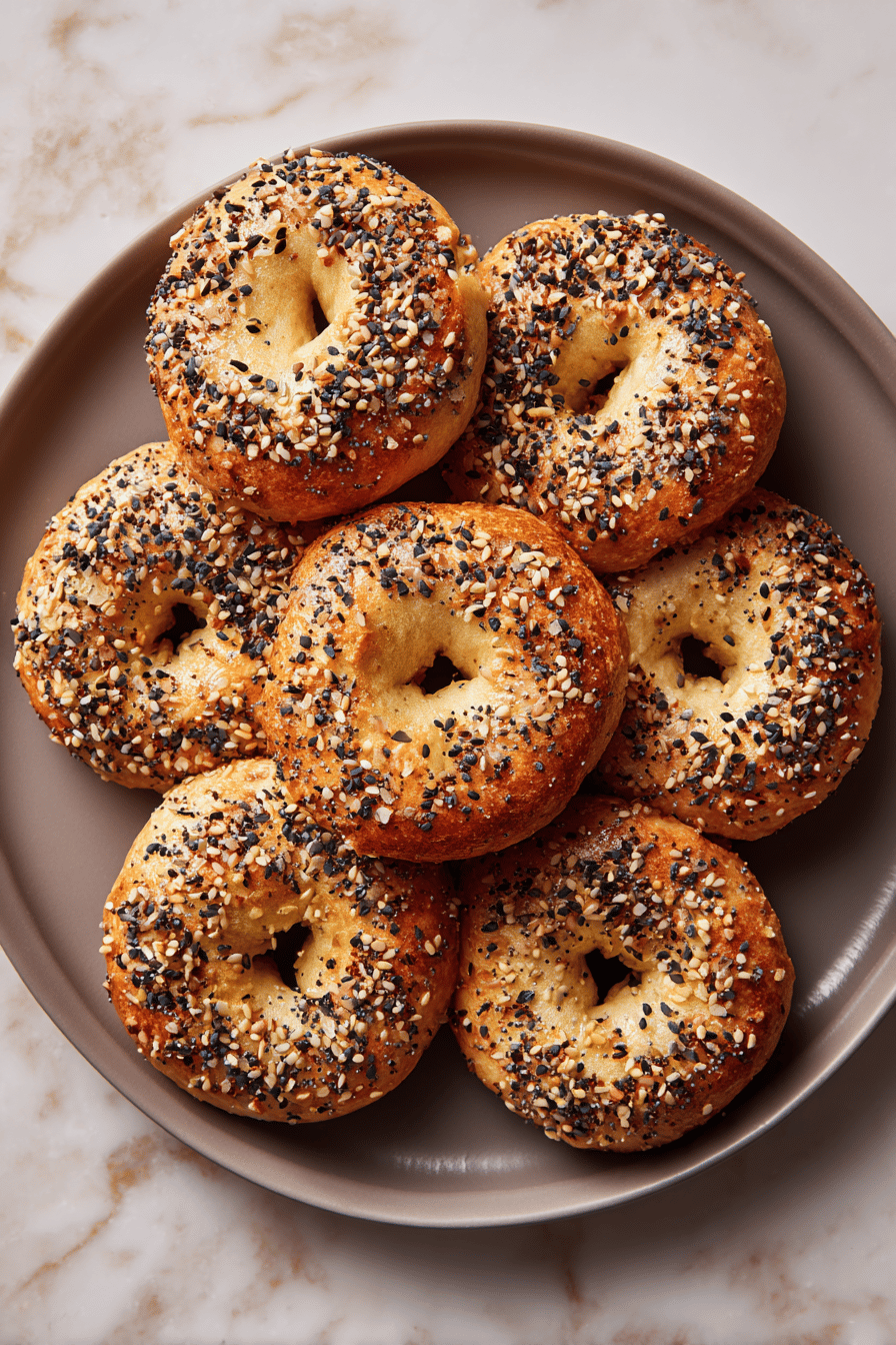 Massa grudenta, pode assustar, mas é sinal de boa hidratação — trabalhe ligeiramente com farinha para modelar. O segredo do bagel com buraquinho central é fechar muito bem as extremidades do cilindro. Para pincelar o ovo, uso pincel de silicone, mais prático pra espalhar. Sementes pressionadas com cuidado para não caírem durante o cozimento. Airfryer varia muito, fique perto do aparelho nos primeiros usos para ajustar tempo e temperatura. Dar uma leve prévia, pré-aquecer a máquina, acelera o cozimento e ajuda o brotinho de bolha no topo se formar melhor. Girar os bagels no meio do processo é obrigatório para dourar por igual. Se sobraram bagels, armazenamento em saco plástico fechado fora da geladeira mantém maciez por algumas horas, mas esquentar na torradeira antes de servir resgata o frescor. Evite usar papel alumínio em airfryer, interfere na circulação do ar e crocância.