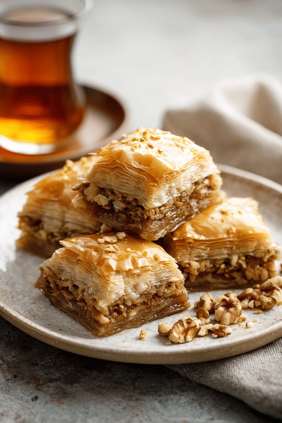 - 💡 Corte o baklava antes de assar. Use faca de serra fina. Isso evita que as camadas deslizem. A apresentação conta muito, não deixe isso de lado.