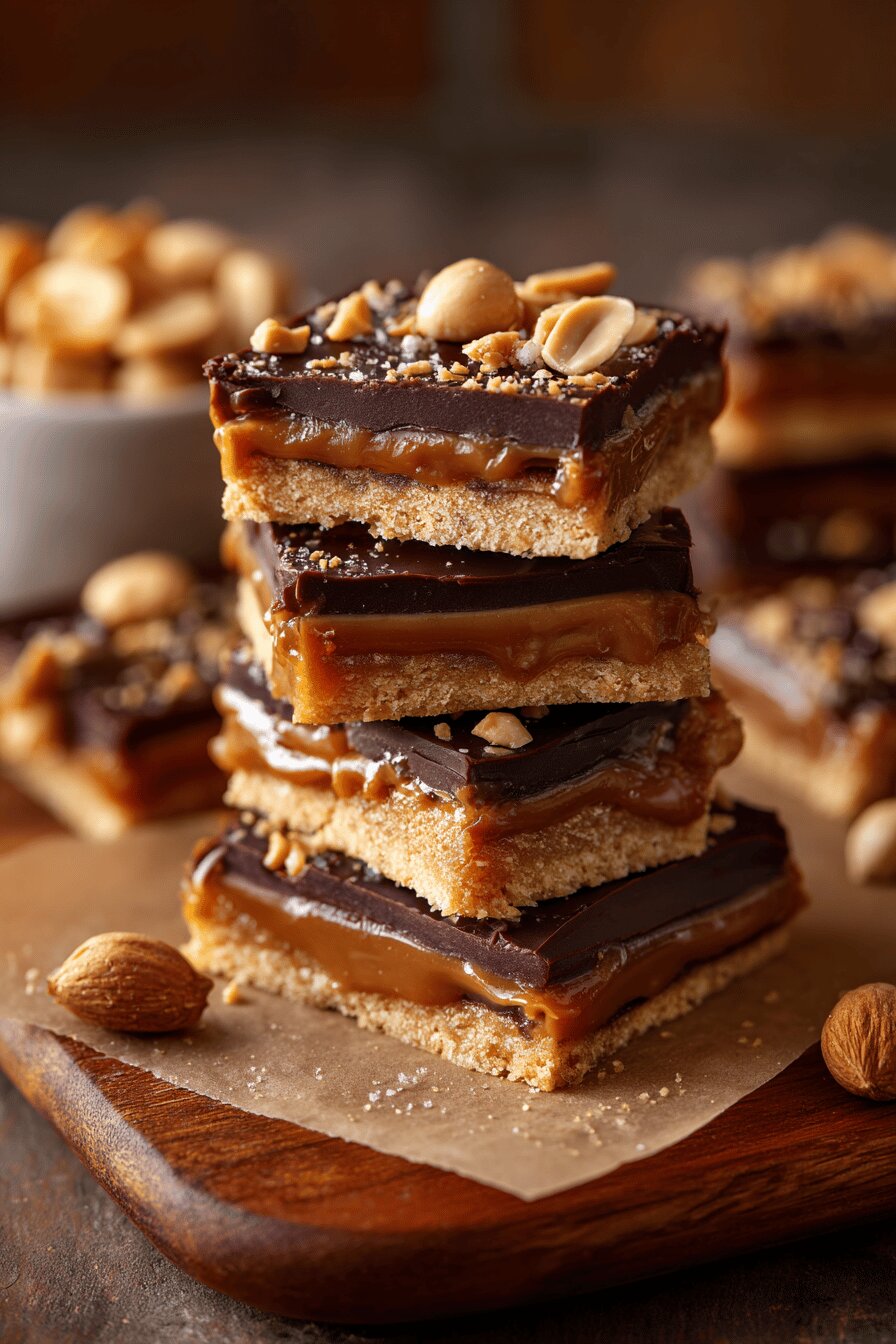 Massa crocante com toque amanteigado, cobertura cremosa de caramelo misturada com amendoins tostados e salgados, finalizada com respingos de chocolate meio amargo opcional. Assa em forno médio, resfria e corta em quadradinhos. Combinação de texturas entre o quebradiço da base e o caramelizado pegajoso com crocância dos amendoins. Ideal para lanche rápido ou acompanhamento de café. Armazena até uma semana em pote fechado à temperatura ambiente. Receita vegetariana, sem ovos e sem castanhas. Usos de ingredientes comuns e medidas caseiras brasileiras adaptadas a gostos locais com toque especial na mistura do caramelo.