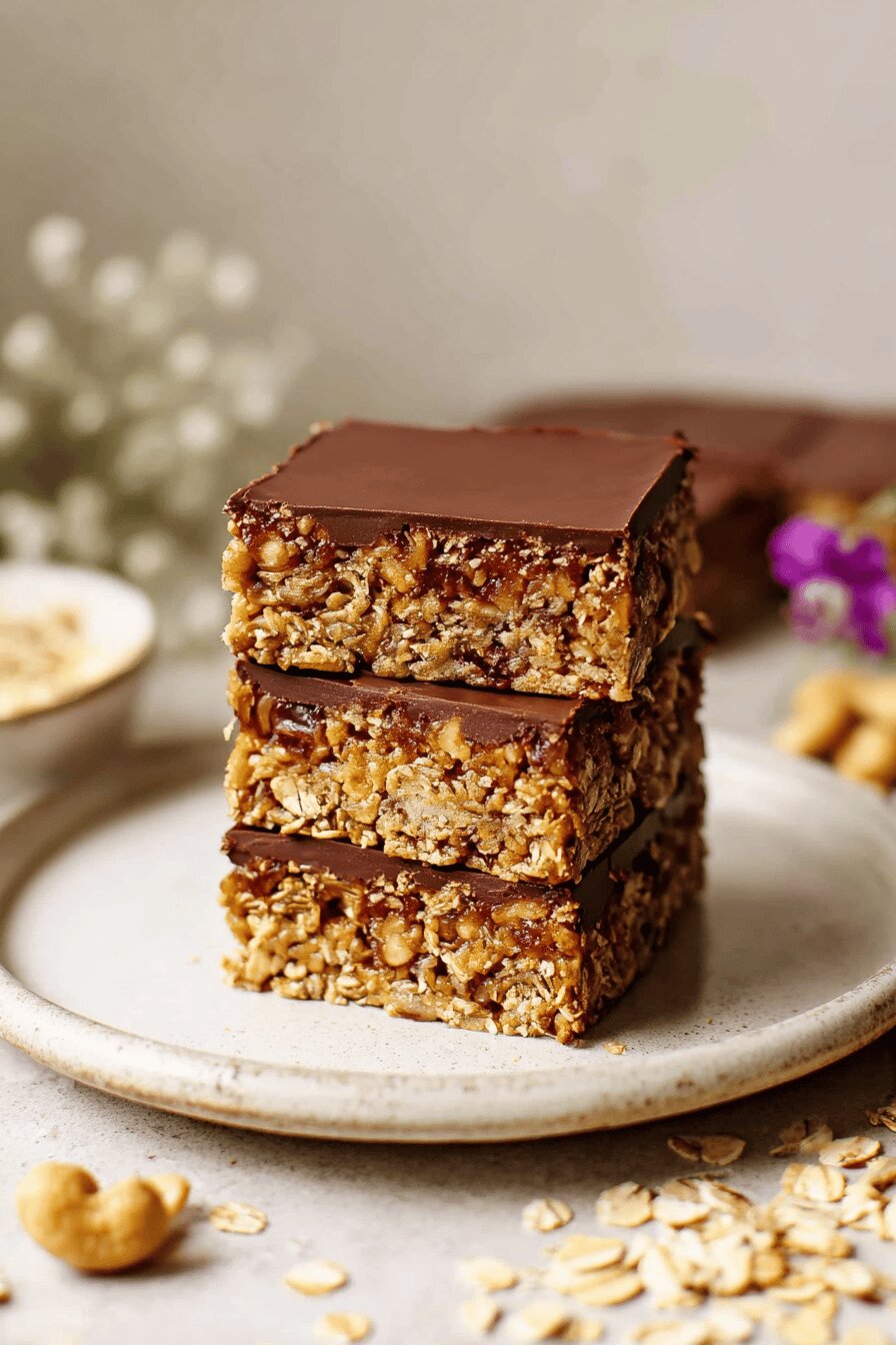 Assar com papel manteiga ajuda a soltar as barrinhas fácil. Acompanhe mais pelo aspecto que pelo tempo; o centro não pode ser mole demais senão quebra na hora de cortar. Misturar a massa direto na tigela reduz louça e garante que tudo fica uniforme. Se não tiver micro-ondas, aqueça a ganache em banho-maria, sem apertar muito o fogo para evitar que queime o cacau ou separe a gordura da pasta de amendoim. A cobertura tem que estar fluida, tipo creme para espalhar. Refrigeração é fundamental para firmar barrinhas e deixar a cobertura perfeita, quem tenta cortar quente acaba com migalhas e camada irregular. Use faca grande e afiada, limpa entre os cortes para manter as bordas limpas. As barrinhas podem perder um pouco da crocância da cobertura na geladeira, então tire do frio 10 minutos antes de comer, se puder.