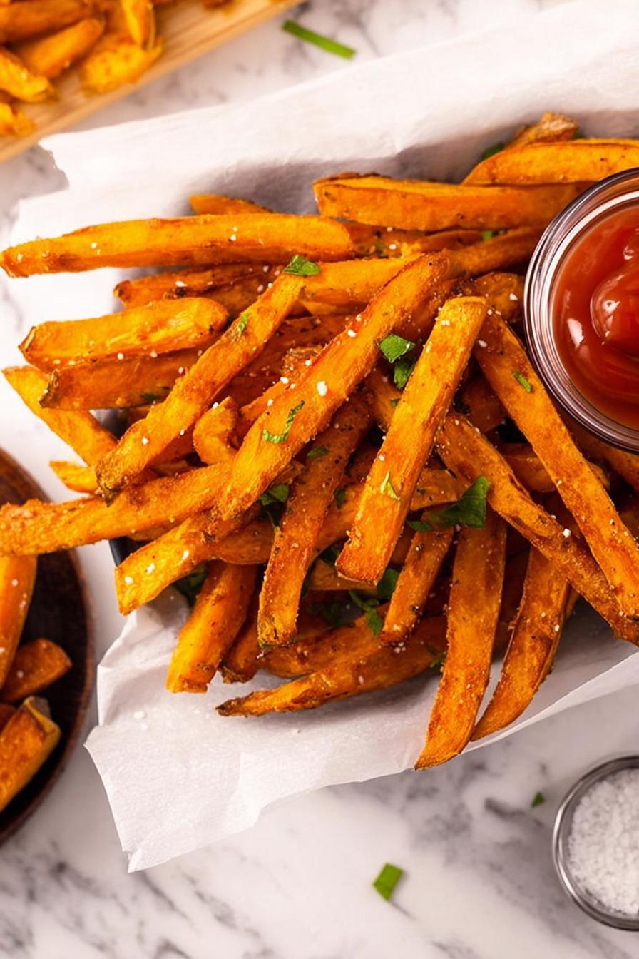 Batata-doce cortada em tiras finas, temperada com azeite, sal, pimenta, alho em pó e páprica defumada, assada até ficar dourada e levemente crocante. Pode ser feita no forno ou air fryer com pequenas variações nos tempos. Serve 4 pessoas, com valores nutricionais equilibrados para um snack saudável. Alternativa fácil e rápida, que usa ingredientes comuns e oferece textura e sabor intensos. Ideal pra quem curte petiscos caseiros, acompanhamento para refeições ou lanche leve.