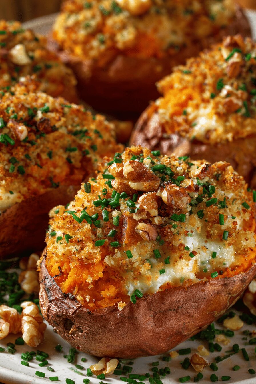 Batata-doce assada no sal grosso, recheada com um creme de queijo cremoso, cheddar forte e ervas frescas, com crocância das nozes. Adaptada para um toque brasileiro usando castanhas de caju e toque de pimenta dedo-de-moça, enriquecendo a textura e sabor. Assada até o queijo dourar, com atenção aos sinais visuais e textura da polpa para não ressecar. Prato vegetariano, sem glúten e sem ovos, ótimo para entrada ou acompanhamento nutritivo e saboroso.