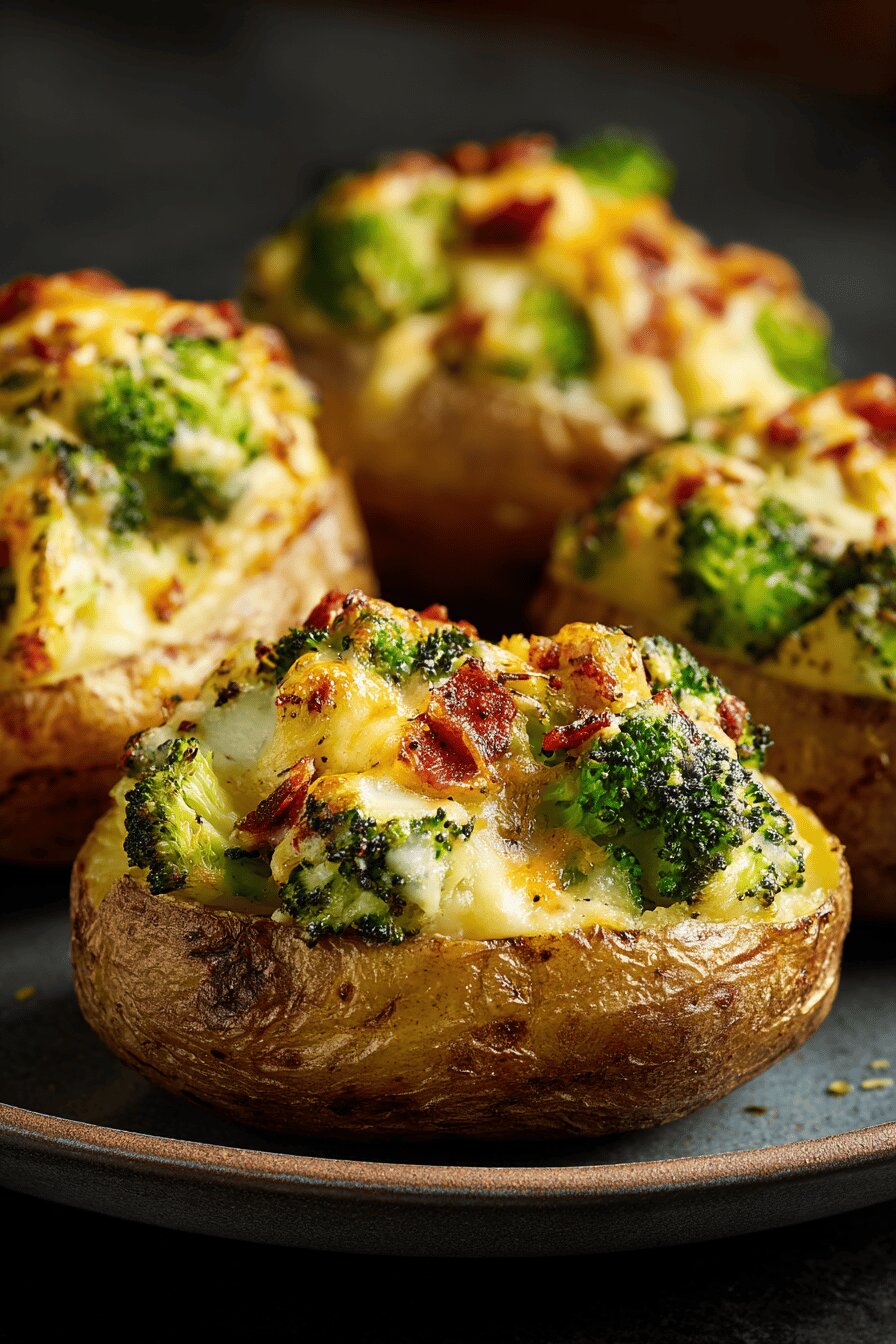 Batatas vermelhas ou russet cozidas e recheadas com brócolis refogado e linguiça italiana. Combinação de texturas entre a maciez interna, que vai do purê temperado com leite e manteiga, e a crocância do topo dourado com queijo derretido. A receita troca meia xícara de queijo minas original por queijo prato ralado, que derrete melhor e ajuda a formar crosta. Troque a linguiça italiana por calabresa suína para um toque defumado e apimentado. O cozimento é uma mistura de micro-ondas para acelerar e forno para gratinar. Fica ótimo para entrada ou acompanhamento e adapta bem a pequenos ajustes conforme o que tem em casa. Sem glúten, sem ovos, sem nozes.
