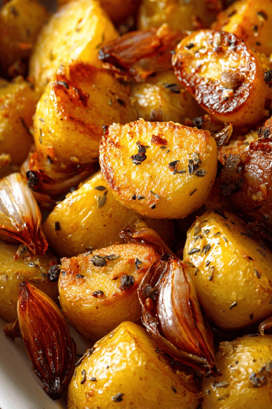 O segredo está em dourar cebola primeiro sem pressa, garantindo uma base caramelizada para todo o prato. Usar panela que vai ao forno evita sujar mais. Colocar as batatas inteiras ou em pedaços grandes evita que desmanchem no cozimento longo. Importante abrir o forno a cada 25 minutos para virar batatas, porque o mel e caldo podem concentrar só de um lado, e a cor ficar desigual. Manter o forno entre 175 e 180 graus leva a cozimento uniforme sem queimar. No final, retirar casca dos dentes de alho e misturar com batata espalha o sabor delicado do alho assado, evitando pedaços que podem incomodar quem não curte alho cru ou duro. Serve direto da panela, acompanhando carnes simples, saladas ou até pão rústico.