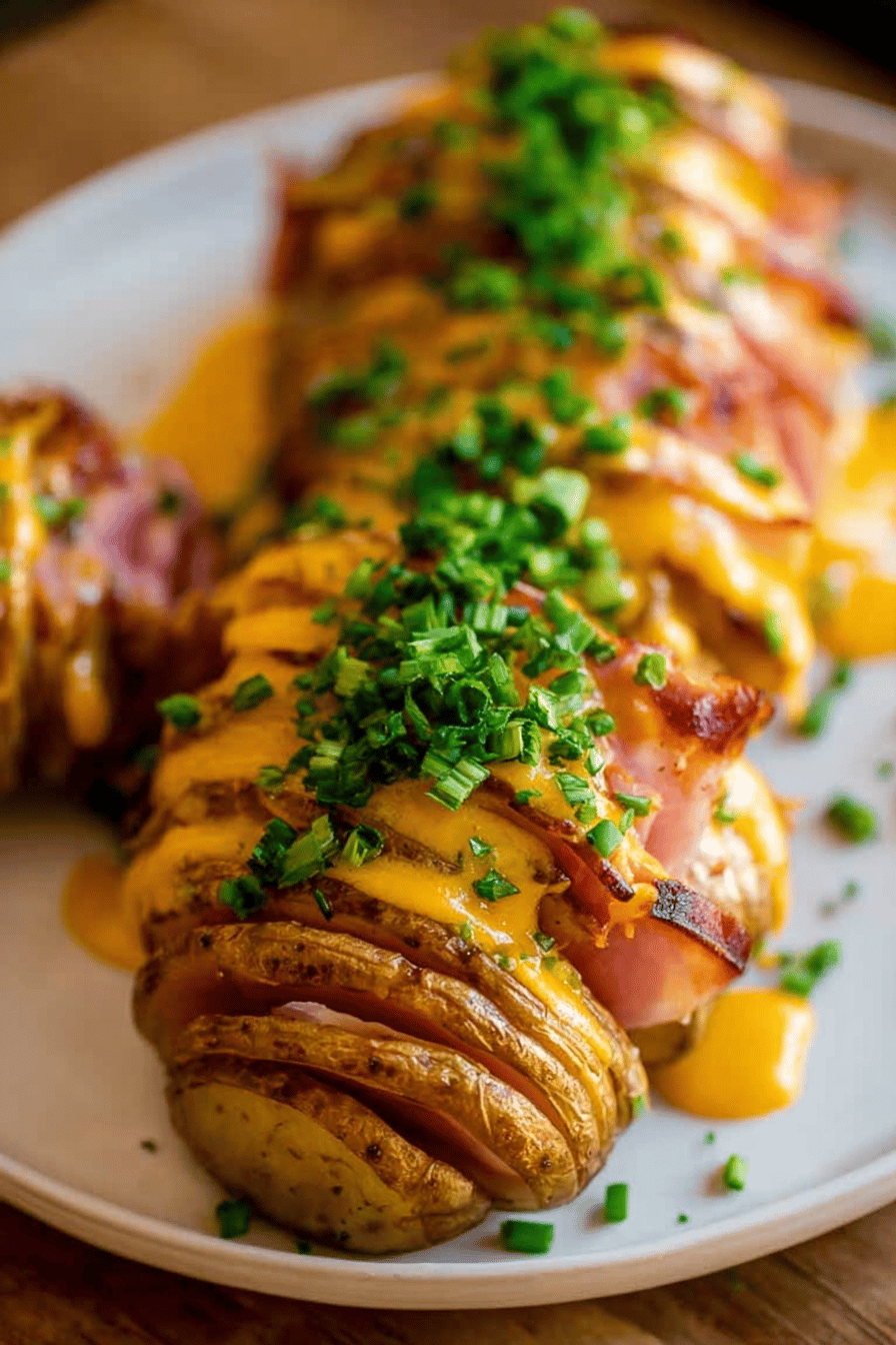 Batatas cortadas em fatias finas sem chegar ao fim, recheadas com pedaços de queijo cheddar e presunto temperado, assadas até ficarem macias por dentro e crocantes nas bordas, tudo finalizado com um molho cremoso e cheiroso que traz um toque especial. A combinação prática e saborosa que exige atenção no ponto das batatas e na montagem, perfeita pra quem curte comida aconchegante mas com um toque gourmet.