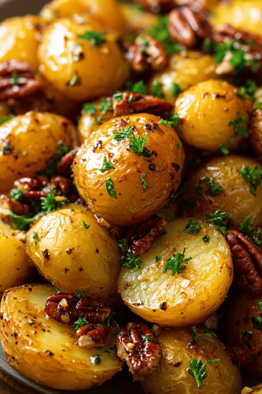 Batatas grelot douradas na frigideira, banhadas em óleo de abacate, com alho, xarope de bordo, sementes de erva-doce trituradas substituindo a coentro, pimenta rosa moída substituindo a pimenta preta, e nozes pecan ao final para crocância. Assadas no forno baixo até ficarem macias, mexidas com frequência para caramelizar sem queimar. Acompanhamento de carnes ou saladas mais rústicas.