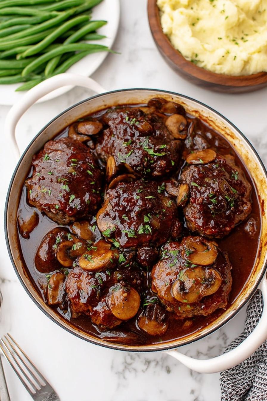 Bifes de carne moída moldados, combinados com farinha de rosca, mostarda Dijon e ovo, levemente misturados para manter textura. Selados até dourar; depois envoltos em um molho espesso de cebola e cogumelos refogados, enriquecidos com caldo de carne, molho inglês e um toque de extrato de tomate. Molho encorpado com amido de milho, ajustado no sal conforme preferência. Receita prática, com tempos flexíveis baseados em sinais visuais e texturas, equilibrando sabor intenso e conforto caseiro em quatro porções generosas.