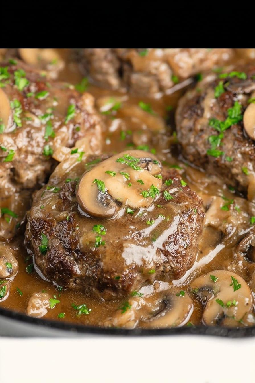 Mistura carne moída com um toque de molho shoyu, alho e cebola em pó, além de farinha panko pra manter maciez. Bifes dourados na manteiga, devolvidos pra panela com caldo de carne e molho inglês. Cebolas e cogumelos refogados até ficarem bem douradinhos, formando base do molho. Processo de redução intensa pra engrossar e prender no bife, finalizado com salsa fresca pra dar frescor. Com toque opcional de páprica defumada trocando o alho, ganha outra dimensão. Aprendi que mexer demais a carne estraga textura; respeito a pausa entre tampa e fogo baixo faz o molho encorpar melhor. Simples, mas cheio de sabor e técnica pra garantir suculência e molho perfeito.