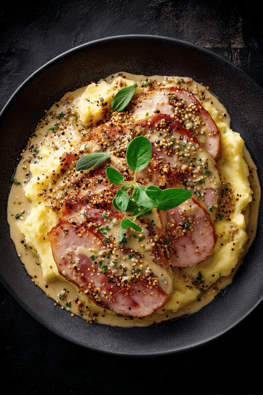 Fatia grossa de presunto defumado dourada na frigideira com crosta levemente temperada. Molho rico e cremoso de sálvia fresca, com toque de mostarda e vinho branco, reduzido na medida certa. Um prato sem lactose, sem glúten, que une técnica e sabor transformando um ingrediente simples num verdadeiro protagonista. O segredo? Atenção ao ponto do molho, equilíbrio de sabores e poucos ingredientes transformados com cuidado e rapidez. Acompanhe com purê cremoso para fugir dos óbvios, textura e conforto na mesma garfada.