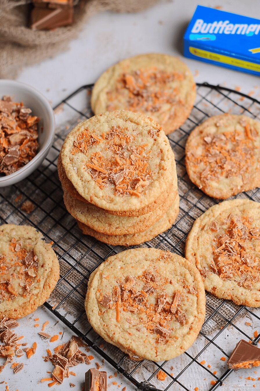 Biscoitos chewy com pedaços de Twix, manteiga, açúcar mascavo escuro e farinha peneirada com amido de milho. Massa firme, textura macia e com crocância doce dos chocolates. Receita adaptada de um clássico com mudanças para equilíbrio maior entre doce e massa. Tempo total aproximado de 25 minutos para preparo e cozimento, rende cerca de 24 unidades.