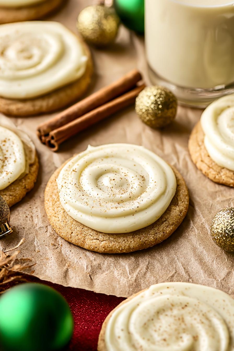 Biscoitos macios, levemente aromáticos com especiarias e um toque de rum. Massa cremosa, envolvendo açúcar com canela e noz-moscada para crocância e sabor extra. Cobertura de cream cheese batido com eggnog, um toque alcoólico sutil e especiarias. Dourando rápido, delicados no visual, ficam perfeitos com crocância externa e interior levemente pegajoso, equilibrando o adocicado do glacê. Para quem já tentou biscoitos secos demais, aqui a dica é ver as bordas firmes e centro ainda mole ao tirar do forno. Bateu com manteiga e manteiga vegetal, faz toda a diferença na textura. Quem não tiver rum, usa essência ou só baunilha.