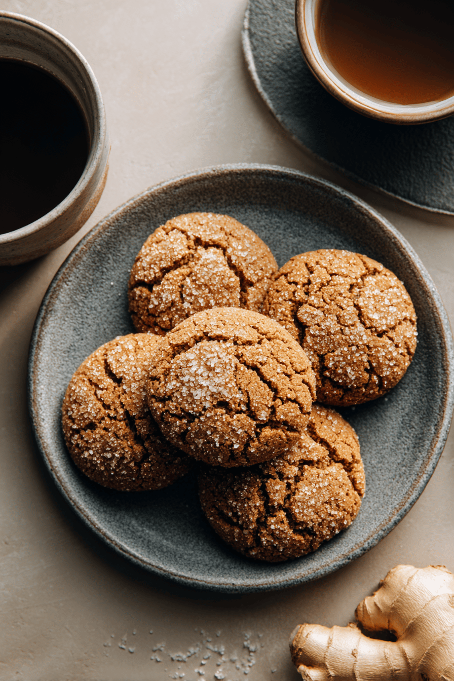 Biscoitos com toque intenso de gengibre, textura firme nas bordas e maciez no centro. Troqueu melaço por melado de cana e gengibre cristalizado por raspas de laranja seca para twist. Massa que não resseca, fácil de manusear, com bom equilíbrio entre especiarias e doçura. Fácil de armazenar em pote hermético, mantém aroma e textura por dias.