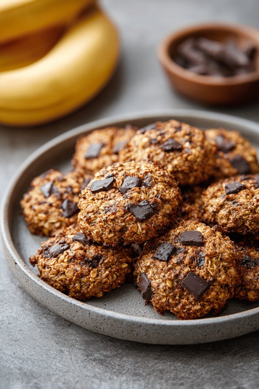 Biscoitos veganos sem glúten, sem lactose, feitos com banana madura, aveia e um toque de cacau amargo. Uma combinação nutritiva que equilibra fibras, gorduras boas e adoçantes naturais. Fácil preparo, textura úmida sem molenga, com crocância na borda. Receita adaptada para usar farinha de coco no lugar das sementes de linhaça e óleo de coco no lugar do óleo vegetal, com um toque extra de raspas de laranja para dar aroma. Cacau em pedacinhos traz sabor intenso e energia. Cozido até dourar nas pontas; guarda 3 dias em pote fechado.
