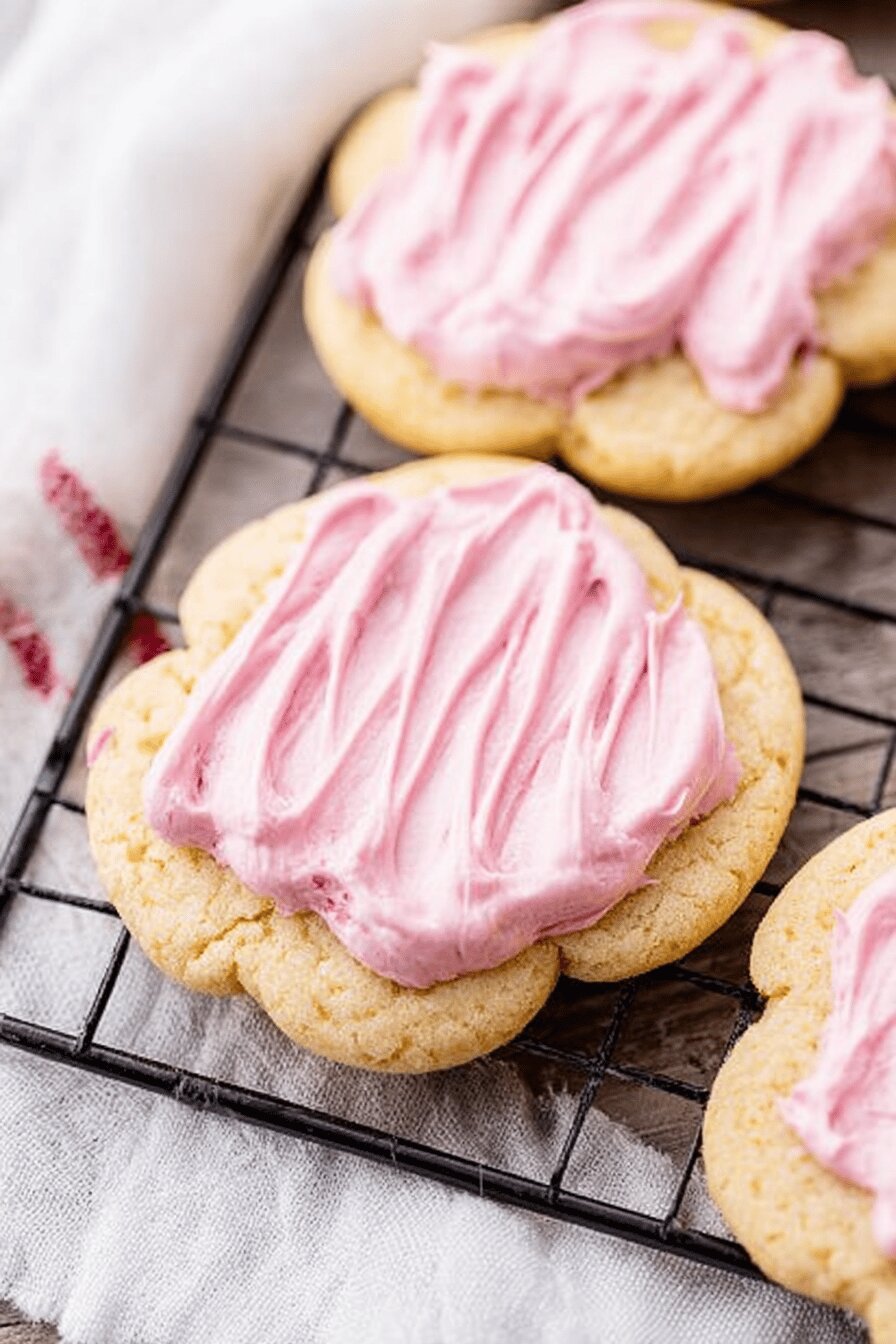 Biscoitos crocantes nas bordas e macios no meio, com aroma marcante de baunilha e toque sutil de limão siciliano. A massa leva manteiga combinada com gordura vegetal aromatizada para uma textura única. Cobertura rosada feita de creme, açúcar de confeiteiro e uma pitada generosa de corante, ideal para o visual e o sabor. Receita adaptada para ajudar quem já queimou a borda ou teve massa grudenta, com dicas para reconhecer o ponto certo do forno e mistura justa para o equilíbrio perfeito. Rende cerca de 36 unidades, calóricos mas recompensadores.