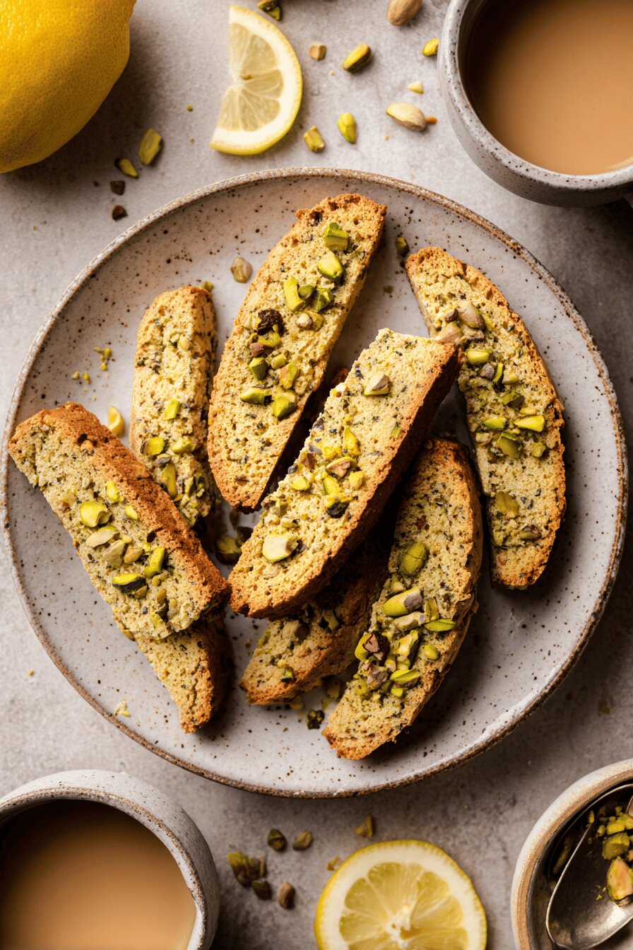 Biscoitos crocantes sem ovos ou laticínios, combinando pistaches tostados com raspas de limão fresco. Textura firme, quebradiça na mordida, aroma cítrico. Receita adaptada para usar farinha integral e substituir bebida vegetal por leite de coco, enriquecendo sabor e umidade. Ideal para quem busca uma opção vegana, rica em fibras e sabor marcante. Processo envolve duas fornadas com corte entre elas, garantindo biscoitos uniformes e dourados. Técnica perfeita pra reconhecer ponto pela cor e teste do palito – evitar assar demais pra não ressecar. Prática fácil para biscoitos tipo cantucci com crocância sem perder maciez interna.