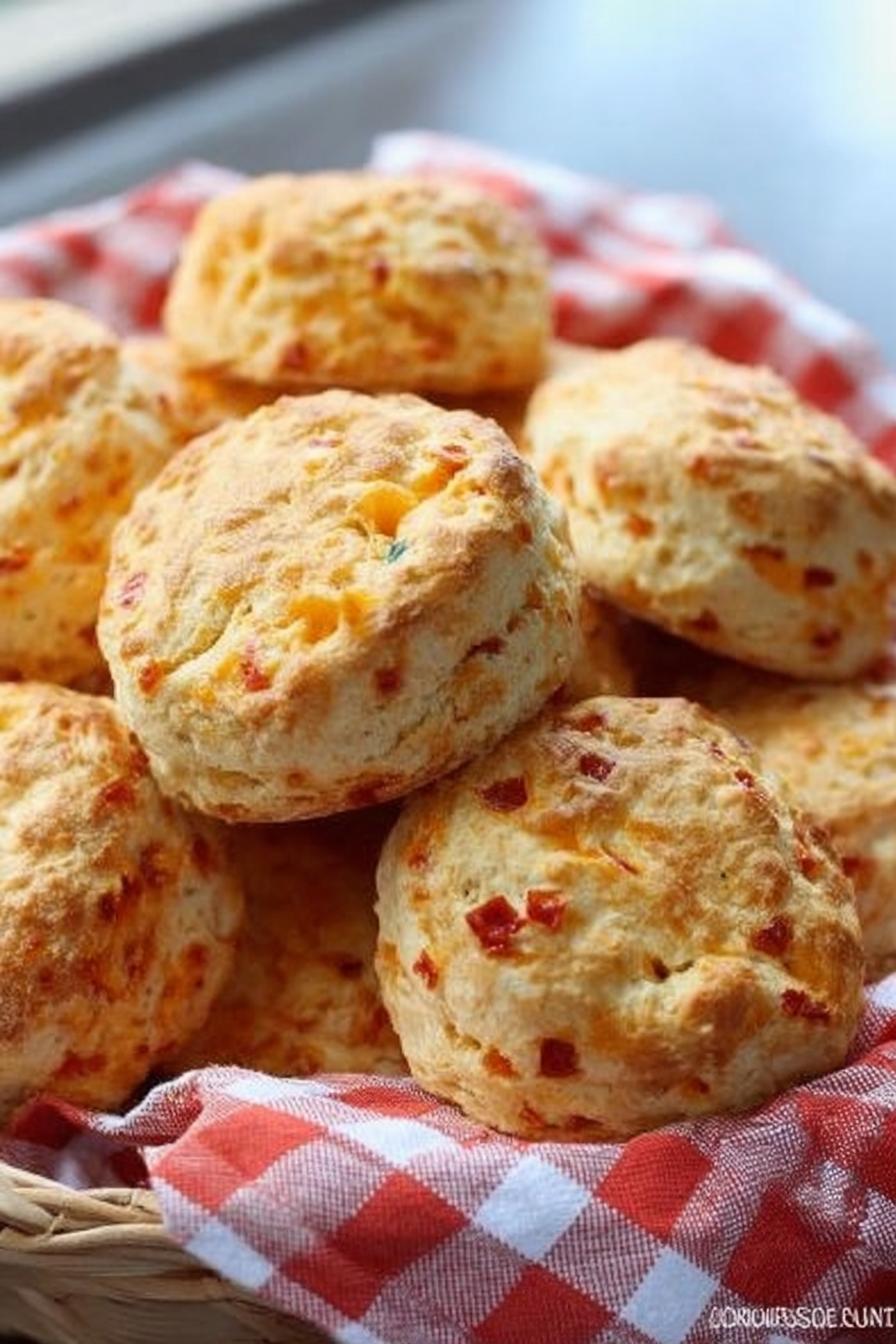 Biscuits com farinha autofermentante, manteiga, leite coalhado, queijo e pimentos, assados até dourar. Massa delicada, macia e com camadas. Textura crocante por fora e úmida dentro. Ideal para café da manhã ou lanche. Substituir buttermilk por leite com vinagre. Técnica importante para trabalhar a massa e criar camadas. Corte reto no biscuit, sem rodar, para crescer direito. Tempo aproximado para assar com observação visual e tátil. Adicionar toque de maionese para umidade extra. Receita adaptada para sabor e textura.