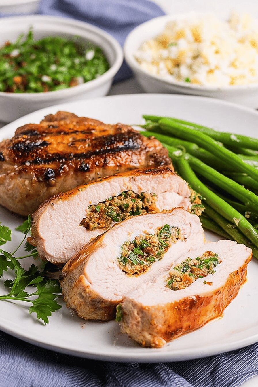 Bistecas suínas salgadas em salmoura leve para garantir suculência. Recheadas com uma mistura de manteiga, alho, farinha panko, queijo parmesão, ervas italianas, páprica defumada e pimenta do reino. Grelhadas em fogo médio-alto, cozimento indirecto para evitar queimar o recheio e manter suculência. Temperos secos combinados antes, pasta cremosa para o recheio. Dica de descanso para uniformizar sucos e finalizar com parmesão ralado e salsinha fresca. Substituição do queijo parmesão por queijo coalho para toque nacional. Tempo ajustado para 6-7 minutos lado na grelha, garantindo textura firme porém macia.