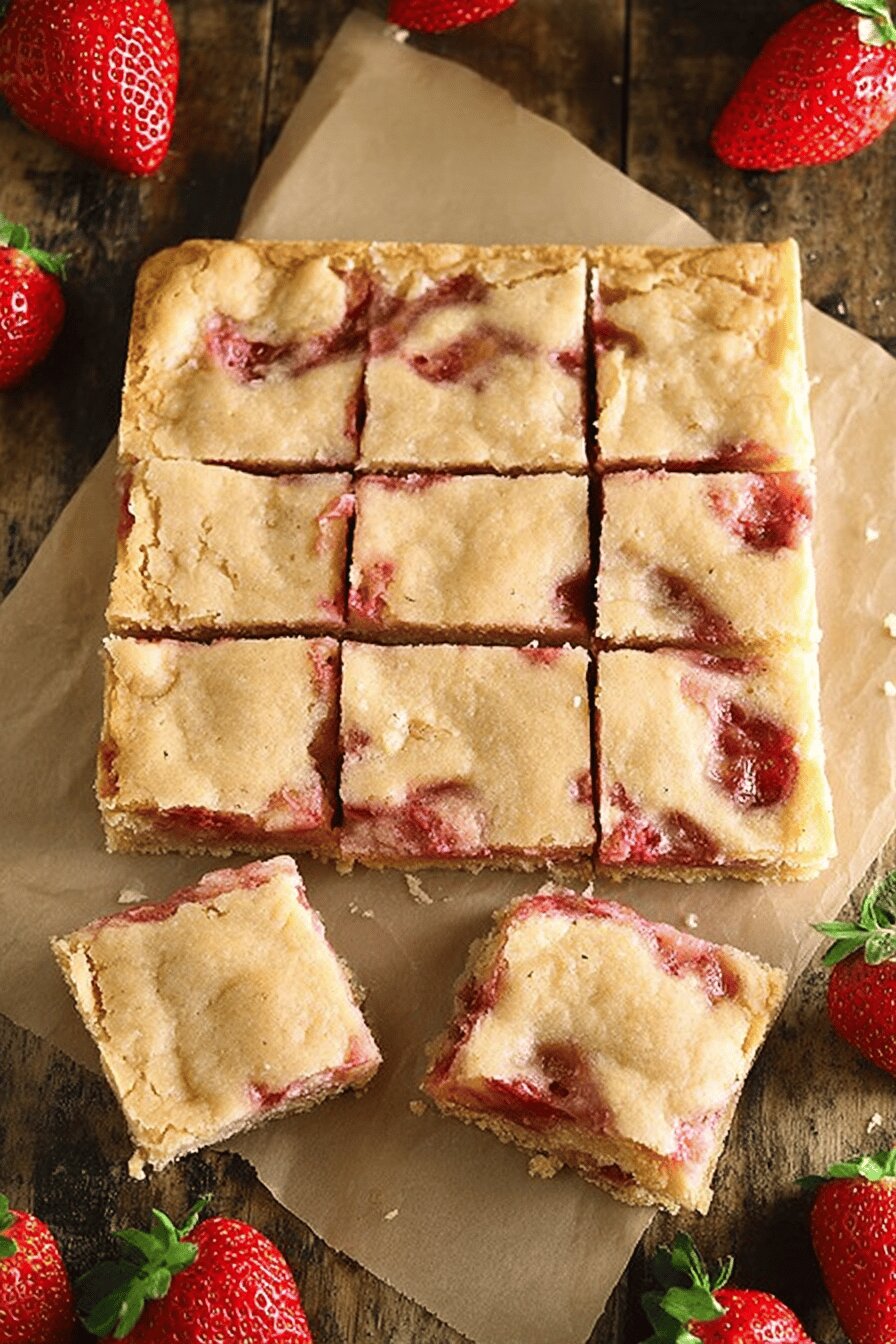 - 💡 Pressione os morangos entre papéis toalhas antes de picar. Se não o fizer, o excesso de água pode deixar os blondies encharcados. Essa etapa é crucial. Blec, já fiz sem e o resultado foi um desastre. Se a massa fica mole, não assa direito e fica tudo esfarelado. Mantenha a firmeza.