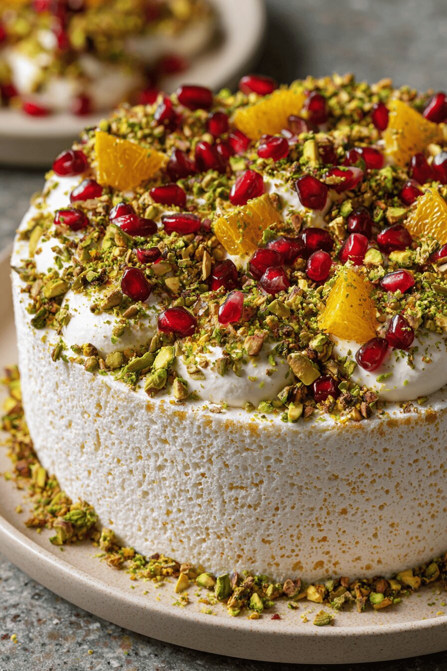 Um bolo chiffon leve com laranja sanguínea e toques inesperados de gengibre e óleo de girassol. A massa ganha volume com merengue firme, equilibrado pela doçura da rapadura ao invés de cassonada. Chantilly de laranja fresco com raspas finas e suprêmes completam, decorado com amêndoas e sementes de romã. O segredo? Tempo e atenção aos sinais visuais e sensoriais para não passar do ponto nem perder a textura aerada.