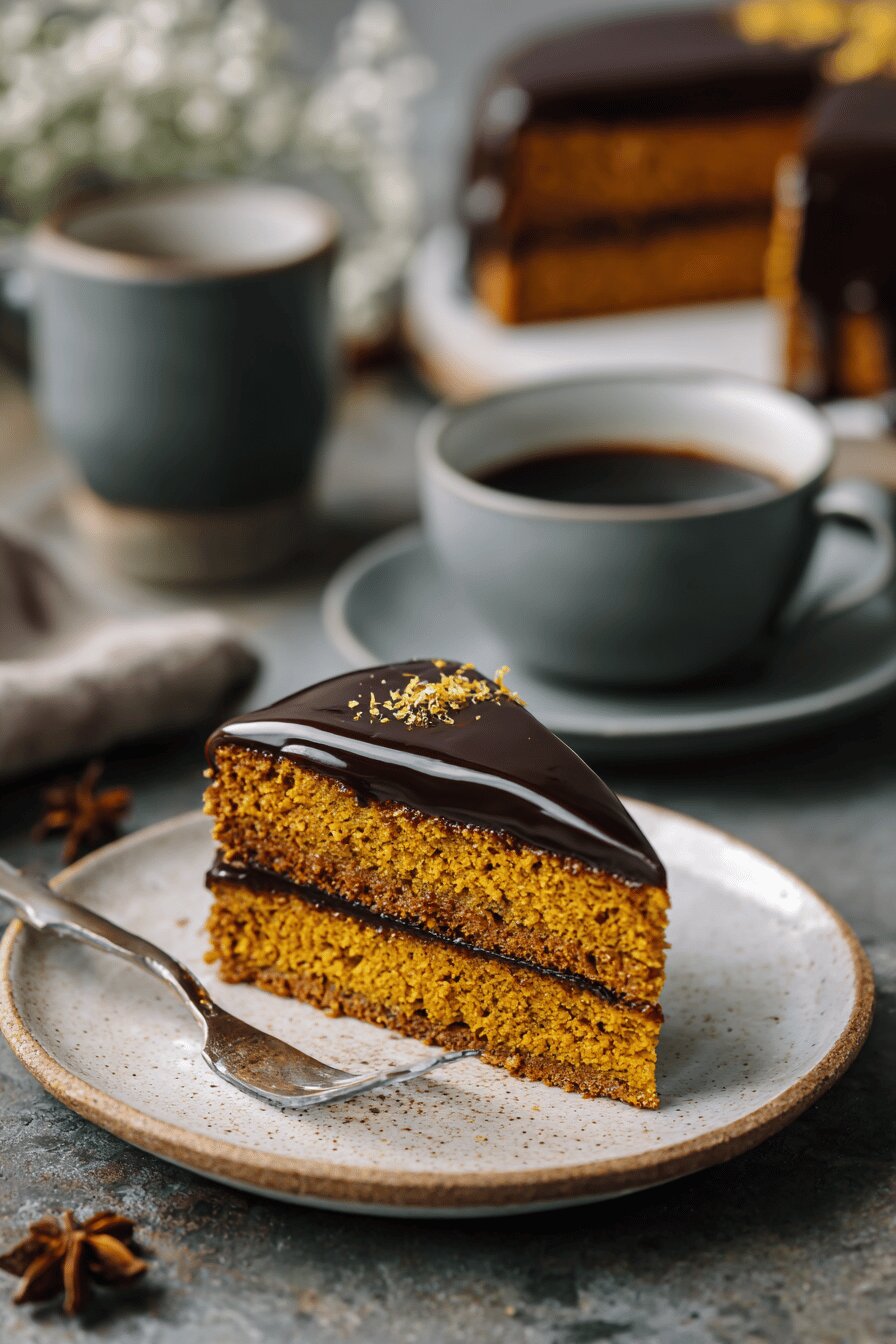Bolo úmido feito com purê de abóbora cabotiá, especiarias delicadas e ganache rica de chocolate meio amargo. Uma mistura de texturas: maciez do bolo e cremosidade intensa da cobertura. Receita vegetariana, sem castanhas, que traz um toque diferente com ingredientes adaptados e preparo pensado para quem valoriza aromas e sabores outonais.