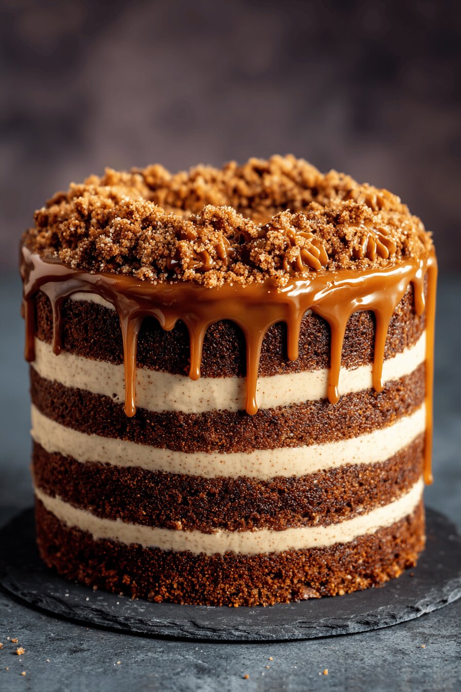 Bolo de chocolate com farinha de trigo integral e cacau processado, fermento e bicarbonato para textura aerada. O toque extra vem da reintrodução das migalhas tostadas no recheio e cobertura que misturam manteiga e doce de leite caseiro. Leva gemas em uma calda de açúcar carameloada com creme de leite para uma ganache mantecada ao doce de leite. Bolo montado em quatro camadas, recheado com creme de manteiga e polvilhado com migalhas tostadas. Finalizado com cobertura de doce de leite espalhada e deixada escorrer nas bordas. Total 2h40min para preparar e assar; muda tempero e método tradicional