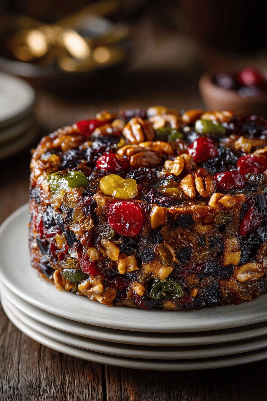 Um bolo de frutas denso e aromático; mistura clássica com uma pitada tropical na escolha das frutas e no toque final com especiarias ajustadas. Fermentação suave e sabor profundo depois de dias de descanso. Troque algumas frutas secas por damasco ou abacaxi cristalizado para variar o perfil. A gordura vegetal pode ser substituída por manteiga clarificada para sabor mais rico, porém perde o toque vegano original. O ponto do bolo é demonstrado pela textura firme porém macia; atenção para não deixar ressecar. Truques para impedir frutas no fundo da forma e como hidratar frutas quando estiver com pressa. Ideal para servir em ocasiões especiais, acompanhado de café forte.