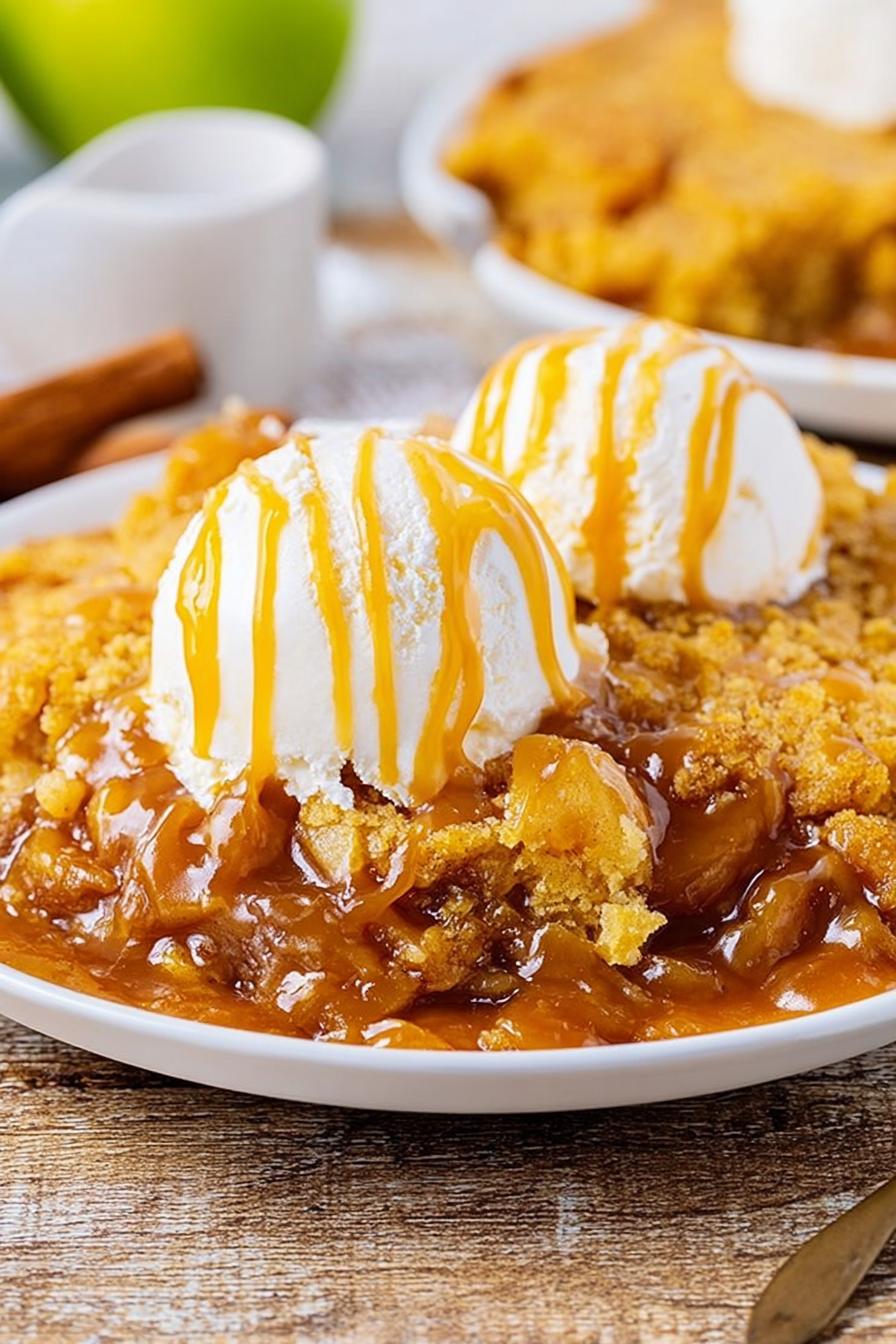 Um bolo de maçã simples de montar, com uma camada de maças em calda coberta por massa de bolo amarelo temperada com canela e noz-moscada. Finalizado com manteiga derretida, leva ao forno até dourar e borbulhar. Serve com sorvete e mais caramelo para quem quer ousar. Um jeito fácil de aproveitar maçãs enlatadas e dar vontade de repetir rápido.