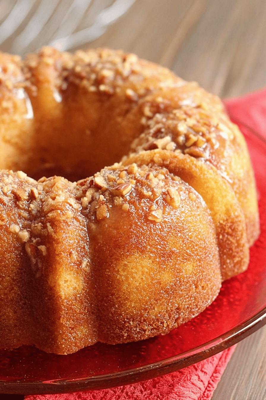Uma variação clássica do bolo de rum, usando suco de abacaxi no lugar da água para um toque tropical. Mistura bolo pronto com pudim instantâneo, ovos, óleo e rum escuro, cozido em forma Bundt com nozes caramelizadas no fundo. A calda de rum, feita com manteiga, açúcar mascavo e suco de abacaxi, penetra toda a massa quente pelos furinhos feitos com palito. A textura úmida e aroma marcante indicam ponto certo. O segredo está em não apressar a retirada do forno e usar materiais da forma para soltar o bolo sem drama. Serve até 12 porções e mantém seu sabor por dias.