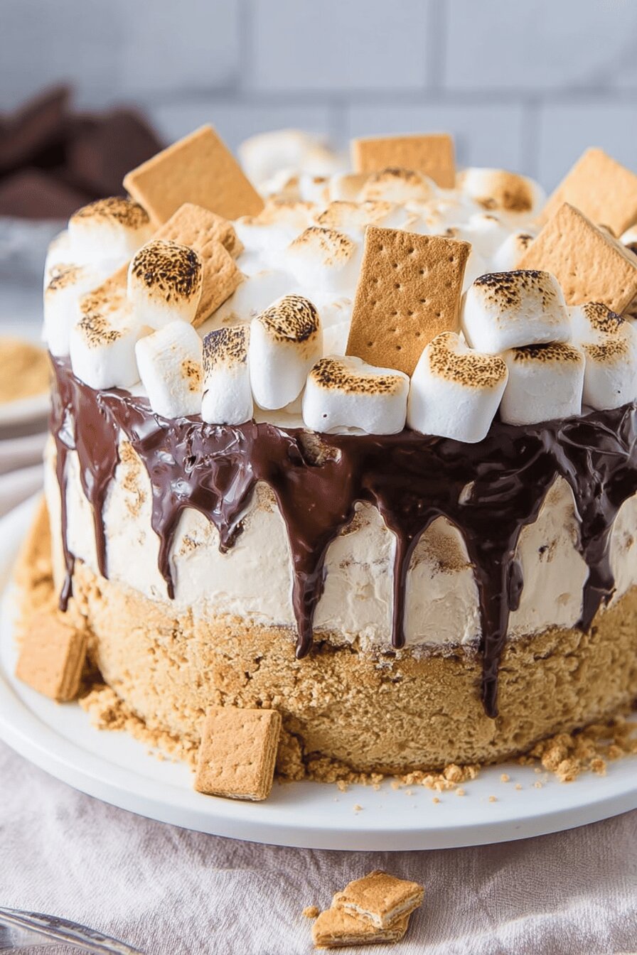 Bolo inspirado no clássico americano S’mores, combina massa de bolo amarela com crocância de biscoito integral, cobertura cremosa de marshmallow e toque intenso de ganache de chocolate meio amargo. Perfeito para quem curte sabores reconfortantes, com aquele contraste entre doce e levemente salgado. Ideal para festas e comemorações. Feito em três camadas, com cobertura batida e ganache para finalizar. Técnicas simples, recompensadas por aroma e textura incríveis. Serve bastante gente, ótimo para dividir e impressionar.