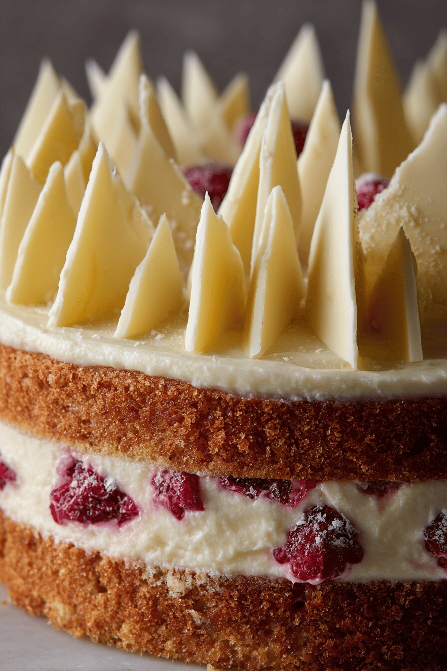 Bolo de baunilha sem glúten. Camadas finas, creme de manteiga feito com calda quente batida nas gemas, chocolate branco e toque de amêndoas. Recheio de framboesas misturadas com cream cheese, cítrico, doce e um pouco azedo. Decoração técnica com chocolate branco, feita como ‘rendas’ que imitam gelo, finas, delicadas, muito visual. Técnica exige paciência pra derreter e temperar chocolate. Detalhe que muda o sabor da calda - usa xarope de milho e quantidade menor de açúcar. Bolo leve, surpreendente, visual sofisticado. Troca ingredientes comuns por cream cheese em vez de mascarpone, sabor mais brasileiro, acabamento mais firme.