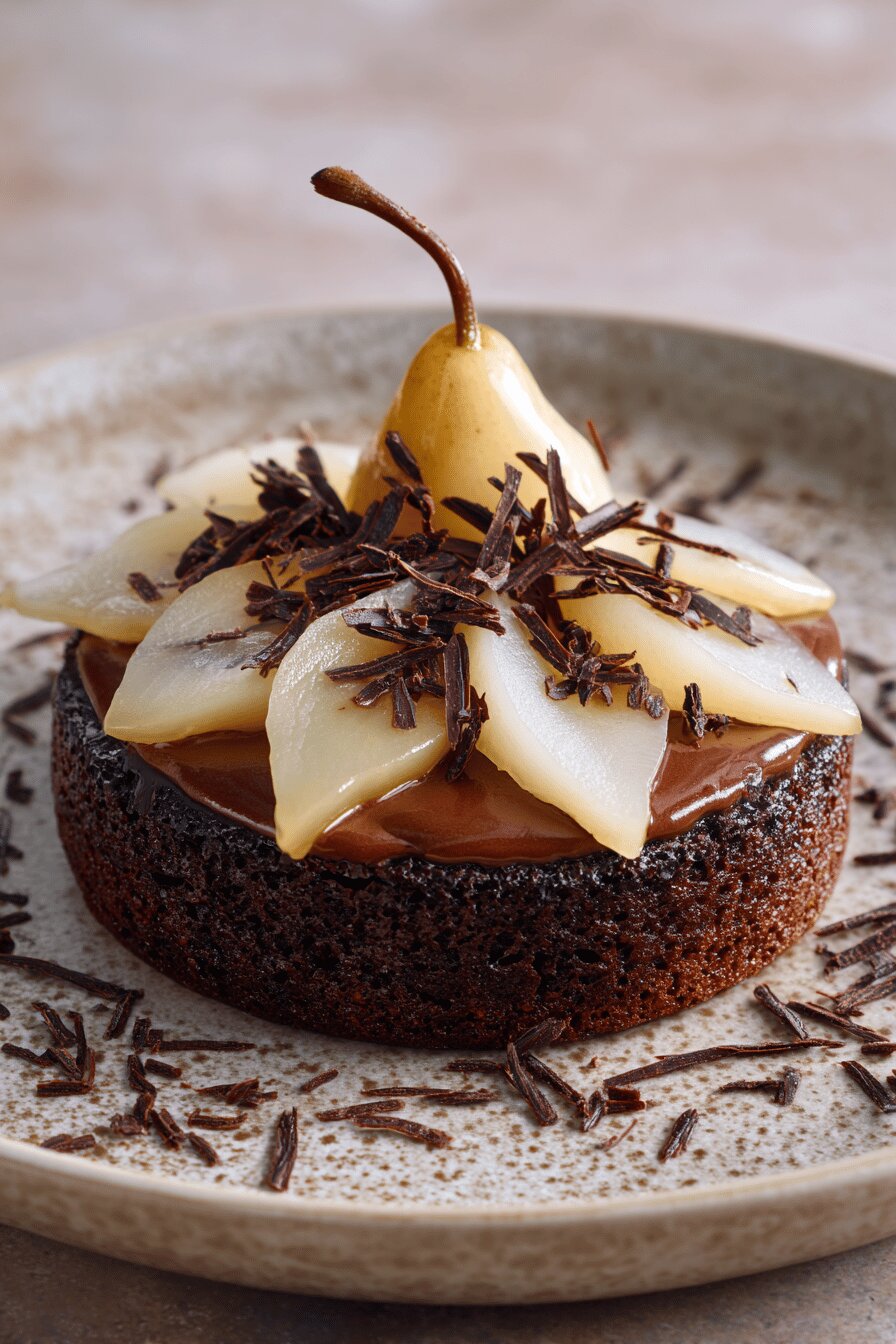 Bolo de chocolate úmido com peras em calda, mousse de chocolate 70% cacau e toque de licor de pera. Massa aerada, fruto daquele segredo de bater ovos e açúcar até triplicar. O contraste entre a fruta delicada e o ganache cremoso cria camadas de texturas, com raspas de chocolate para finalizar. Receita adaptada para o paladar brasileiro, com substituição da farinha branca tradicional por farinha de trigo tipo 1, pequeno ajuste na quantidade de açúcar e a laranja no licor garantindo frescor. Tempo de cozimento controlado pelas bordas douradas e teste do palito. Uma sobremesa que exige paciência na montagem para que o mousse firme na geladeira e o sabor do licor penetre a fruta.