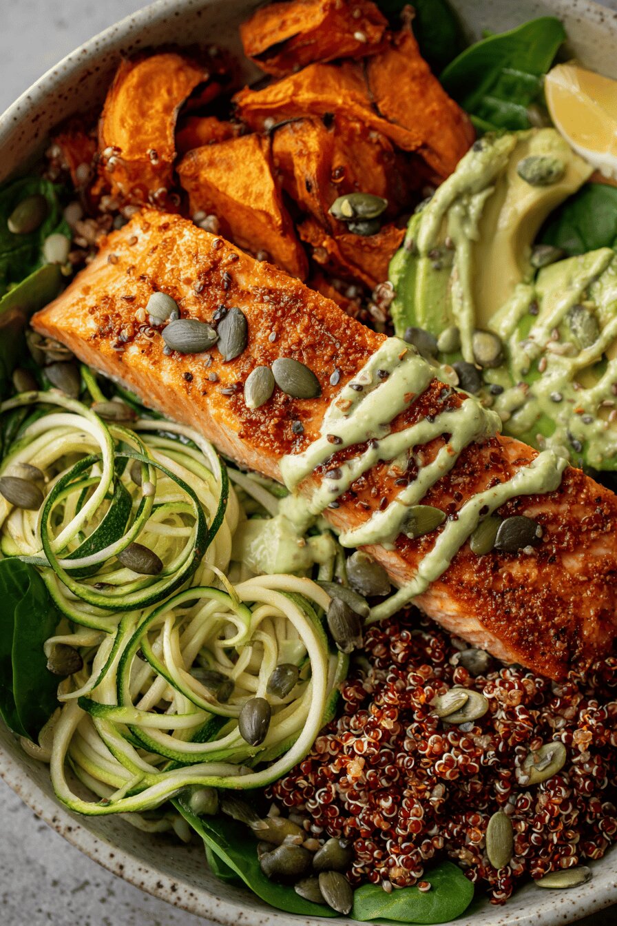 Começa pelo forno, que precisa pegar temperatura alta pra batata doce dourar rápido, uns 18 minutos. Enquanto isso, cozinha-se a quinoa que demora de 15 a 17 minutos. Nunca deje a quinoa na mão, precisa escorrer bem pra não ficar mole demais. Grelhar o salmão rápido, é feito em fogo forte, uns 7 minutos. Deixar descansar na papel toalha pra soltar o excesso de óleo e ficar seco pra montar. Abobrinha não vai ao fogo, só temperada, deixa macerar pouco minutos. Molho é batido ao final, coisa rápida. Na montagem, a ordem evita que folhas murchem, intercalando quente e frio, hidratando os ingredientes sem afogar. Se quiser, uma pitada de pimenta, ou um fio de azeite extra por cima finaliza. Fácil fazer em partes, preparar tudo antes e montar na hora da refeição.