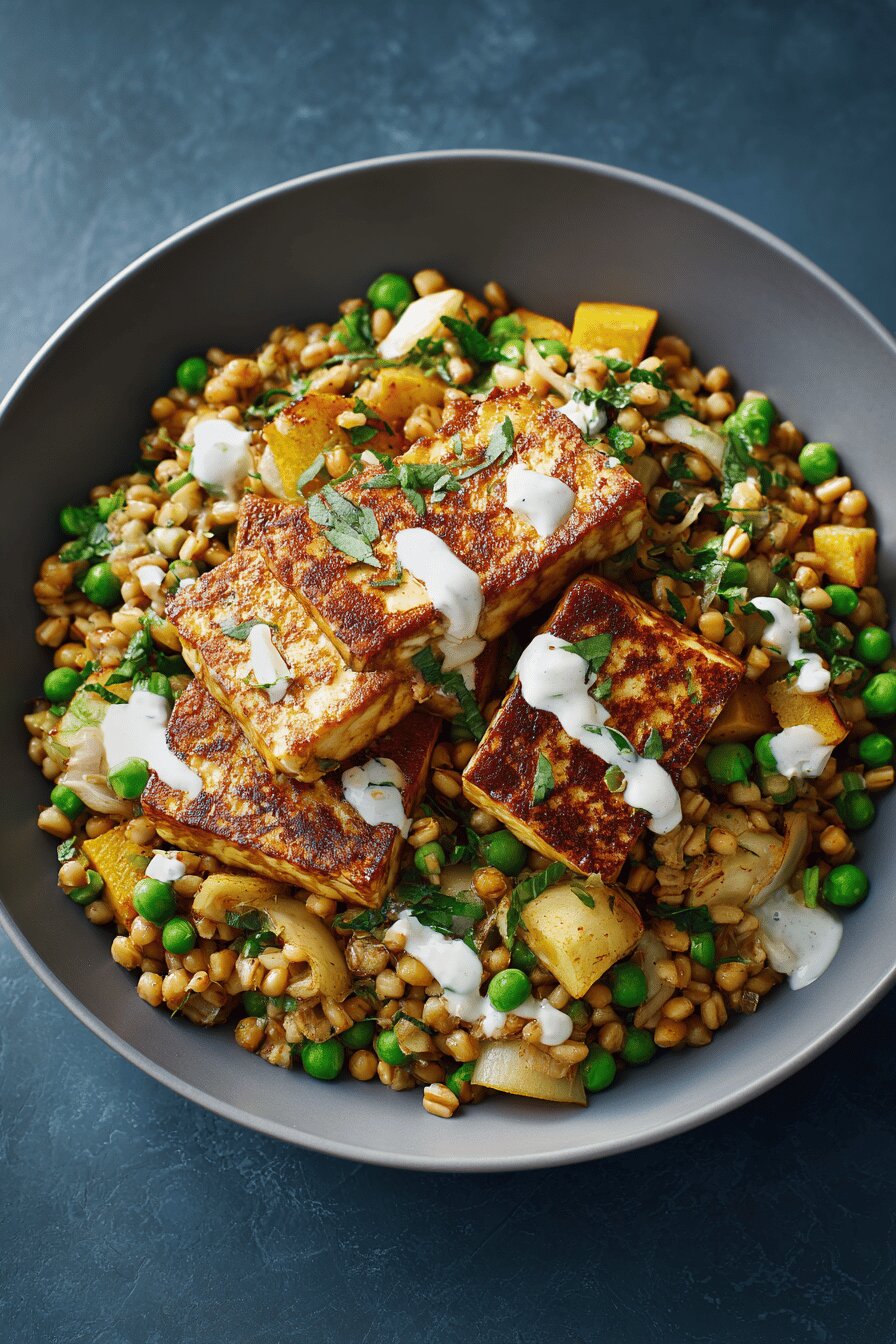 Prato principal vegano com cevada e tofu marinado numa mistura picante de mostardas, limão e harissa. Vegetais assados com toque rústico de cenoura e pastinaga, combinados com edamames verdes para crocância. Vinaigrette de creme vegetal com curry que dá frescor. Fácil substituição de ingredientes e técnicas para resultados consistentes. Tempo total percebido pela textura e aroma dos legumes assados e tofu dourado. Sem lactose, ovos ou oleaginosas. Receitas para quem gosta de brincar com sabores intensos na rotina.