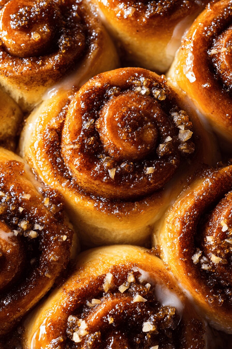 Massa doce enriquecida com manteiga, fermento e ovos. Recheio de açúcar mascavo e canela. Cobertura de caramelo com toque diferente usando melaço e fubá para textura. Final opcional com glacê cremoso de cream cheese. Leva cerca de 1h30min fermentação e 30min cozimento. Serve 8 unidades. Receita com variação nos ingredientes e tempos para sabor surpreendente e massa macia.