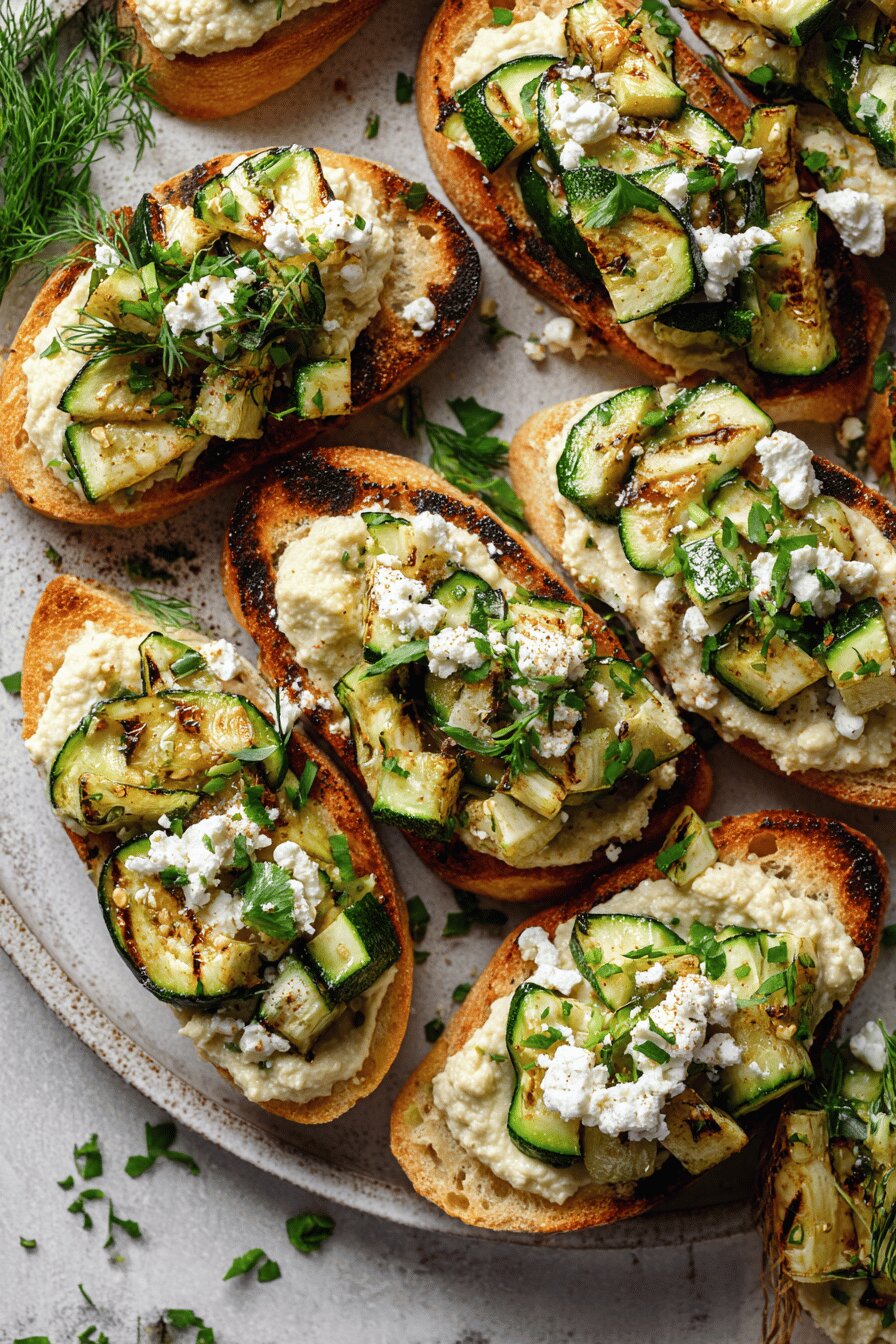 Torradas crocantes com um refogado suave de abobrinha e cebola, temperadas com manjericão fresco, cobertas com homus e finalizadas com queijo feta esfarelado. Um petisco vegetariano e leve, fácil de preparar, uma explosão de texturas e sabores mediterrâneos, versátil para entradas ou lanches rápidos.