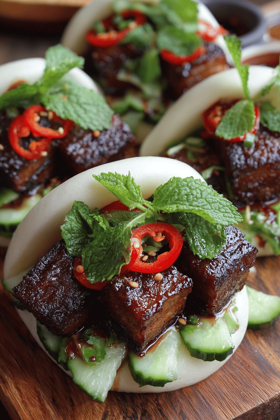 Panceta de porco, marinada na soja e cinco-espécies, deixa aquela pegada asiática forte. Cozida lentamente, pra ficar macia, quase desmanchando. A cebolinha queimada traz aroma defumado, tudo mergulhado num caldo leve de galinha. Refeição que junta doçura, umami e frescor. Pão chinês no vapor foi escolhido. Molho hoisin pra untar, rodelinhas finas de pepino, coentro fresco e pimenta, pra completar a história. Nada de produtos lácteos, ovos ou nozes aqui. Comida simples, com camadas de sabor que convidam a repetir. Pode servir pra um grupo, rápido, fácil, festa na boca. Pra quem curte comida asiática, mas com jeitinho brazuca, essa é a pedida.