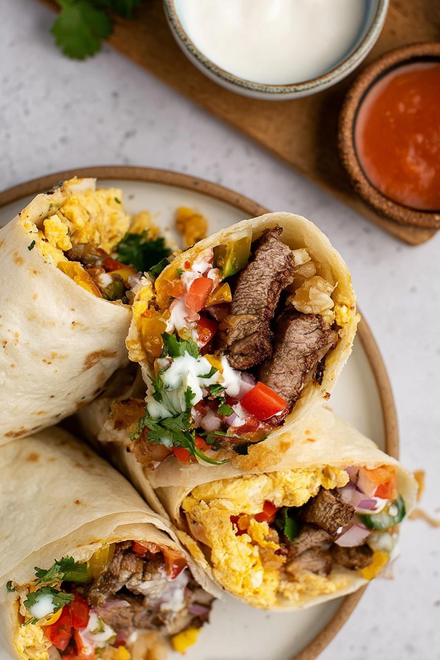 Carne marinada com toque de cominho e limão, pico de gallo fresco, ovos mexidos cremosos, batata crocante e queijo derretido tudo enrolado em tortilla douradinha. Tem técnica pra deixar a carne suculenta e o burrito firme mas macio. Combina grelha com frigideira; cebola e coentro frescos dão aroma vibrante. Ajustei tempo de marinada e temperatura pra evitar carne seca. Uso batata palito pra textura mais irregular, mas aceita tater tots. Receita para 6 burritos de tamanho generoso, entre café da manhã reforçado e almoço rápido, com espaço pra inventar molho, abacate ou creme azedo.