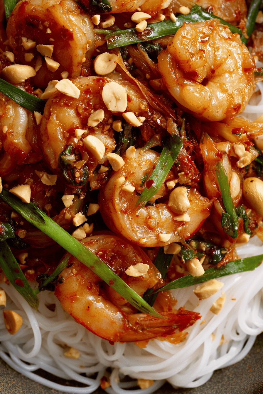 Camarões refogados com kimchi fermentado e um toque agridoce do açúcar mascavo. Troca do óleo de gergelim por azeite de oliva extra virgem e acrescenta pimenta dedo-de-moça para um toque brasileiro. Refogadinho rápido, as cebolinhas aparecem tanto no branco quanto no verde, garantindo textura e frescor final. Servido com arroz aromático para equilibrar o sabor forte do kimchi. Sem glúten, sem lactose e sem ingredientes de origem animal, exceto os camarões. Prato simples, sabor marcante e rapidez na cozinha.