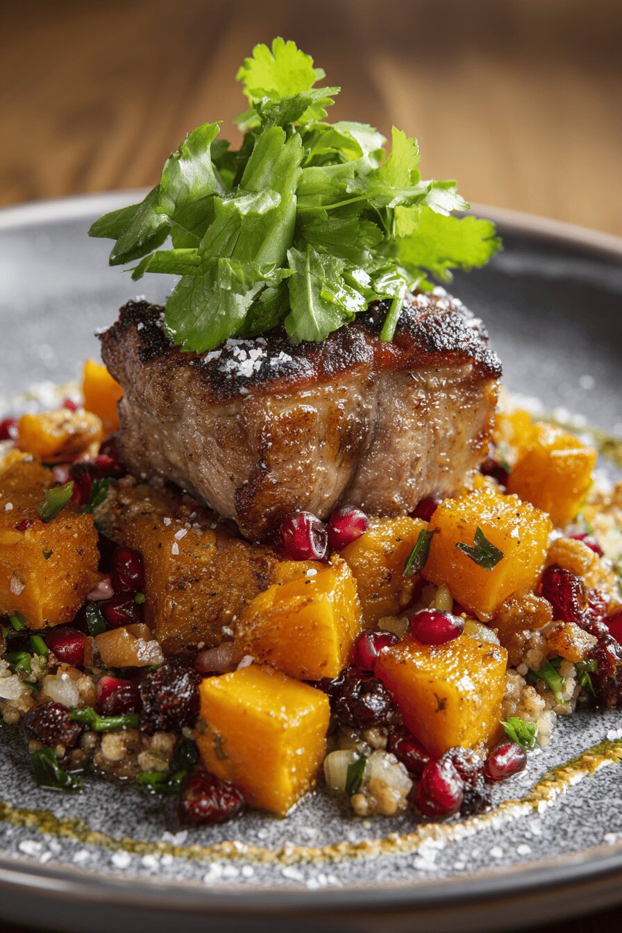 Canapés que combinam abóbora butternut assada com cordeiro suculento e topping crocante de frutas secas e aipo. Uma entrada sem glúten e sem ovos, rica em texturas e sabores contrastantes. O toque cítrico do limão fresco dá leveza ao prato. A abóbora é assada até ficar macia, mordida fácil, e temperada com um pouco de noz-moscada. O cordeiro passa na frigideira até ficar rosado, criando uma crosta dourada que conserva suculência. Sobre a base crocante dos crackers de frutas, o contraste entre o adocicado da abóbora e o salgado do cordeiro se revela. Pequenos detalhes como a flor de sal e folhas frescas de aipo finalizam o prato com charme.